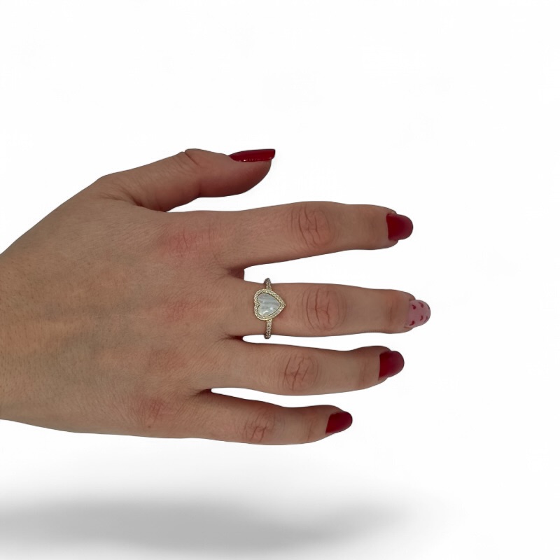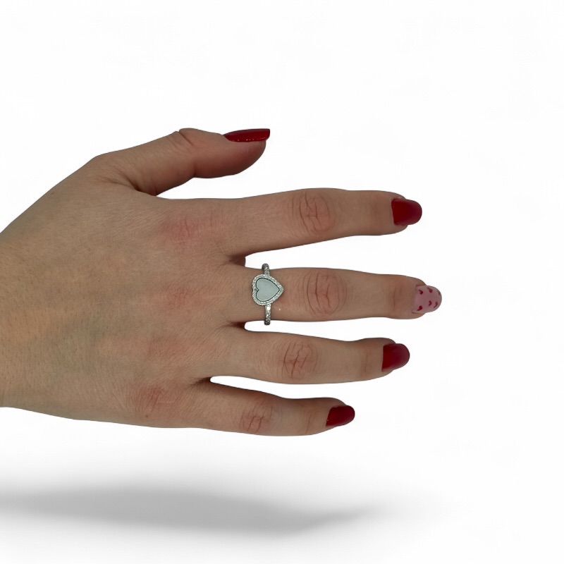 Anello in argento 925 con cuore centrale in madreperla e zirconi. Misura 14 Regolabile