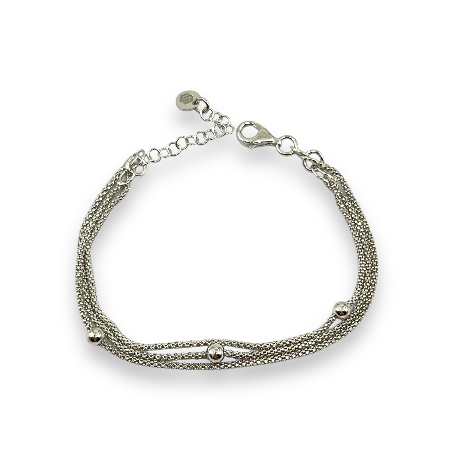 Bracciale da donna in argento 925 composto da 3 catene modello Funetta e 3 sfere lisce, chiusura a molla regolabile. Misura 17 cm + 3 cm di allungo.