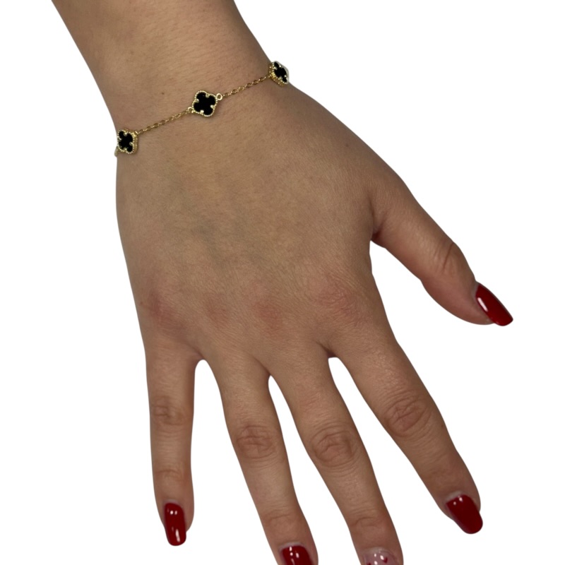 Bracciale in argento 925 con catena veneziana e tre quadrifogli neri. Lunghezza 16 cm + 3 cm di allungo. Chiusura a moschettone regolabile