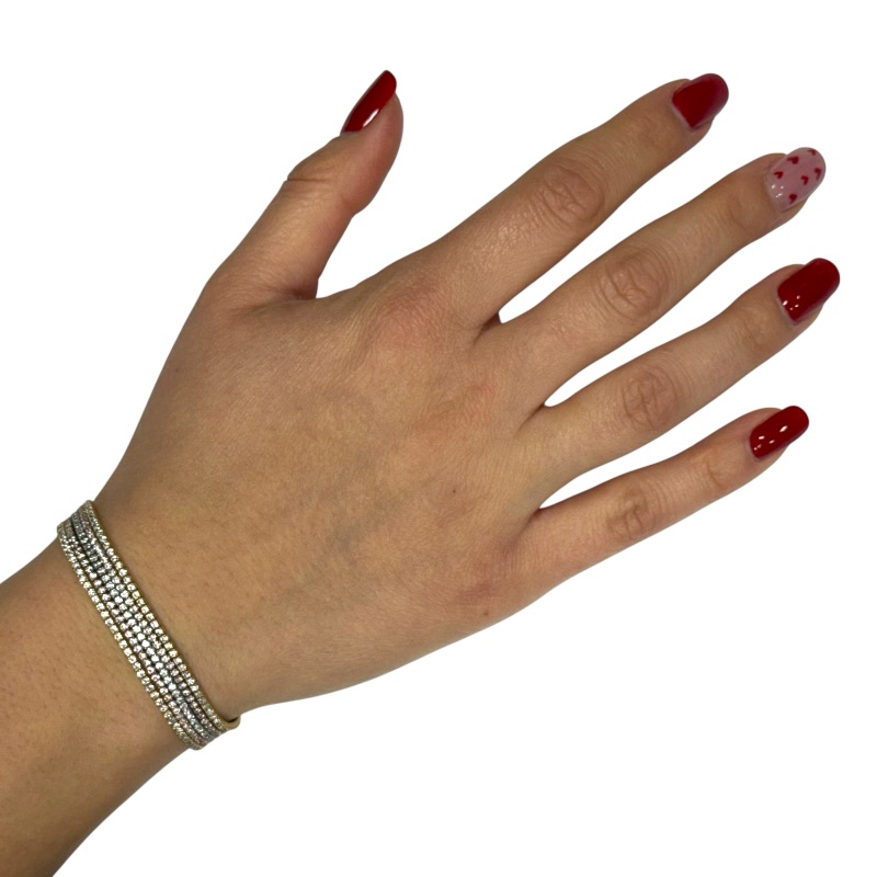 Bracciale da donna in argento 925 composto da 5 fili di tennis . Lunghezza 16 cm + 3 cm di allungo. Chiusura a moschettone regolabile.