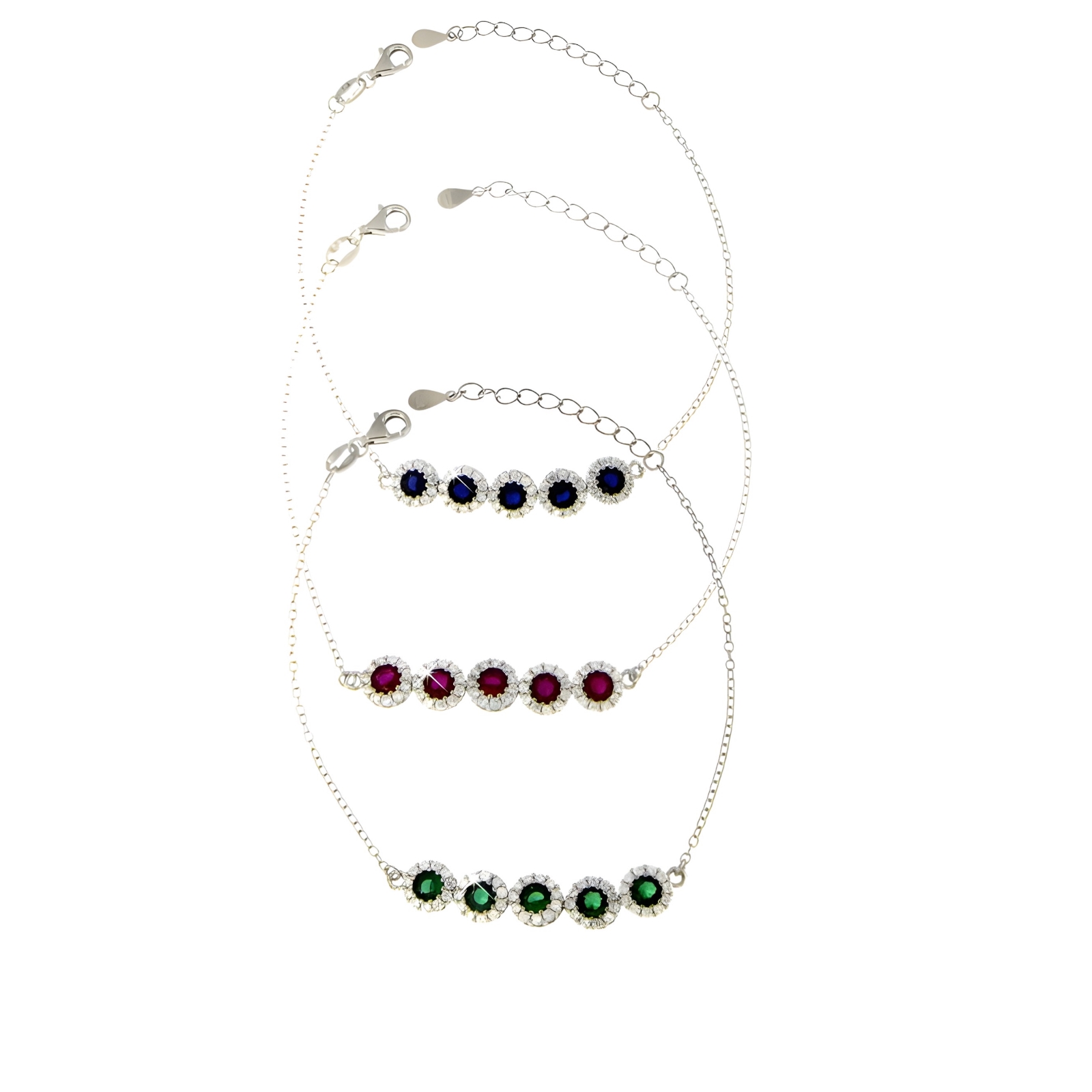 Bracciale da donna in argento 925 con 5 zirconi centrali a forma di fiore. Chiusura a moschettone regolabile. Lunghezza 17 + 3 cm di allungo
