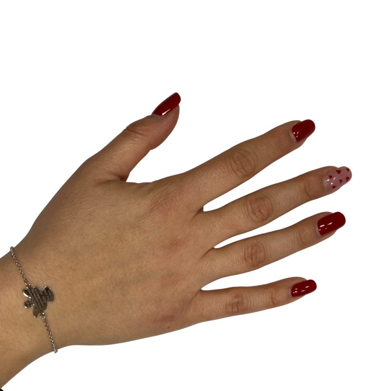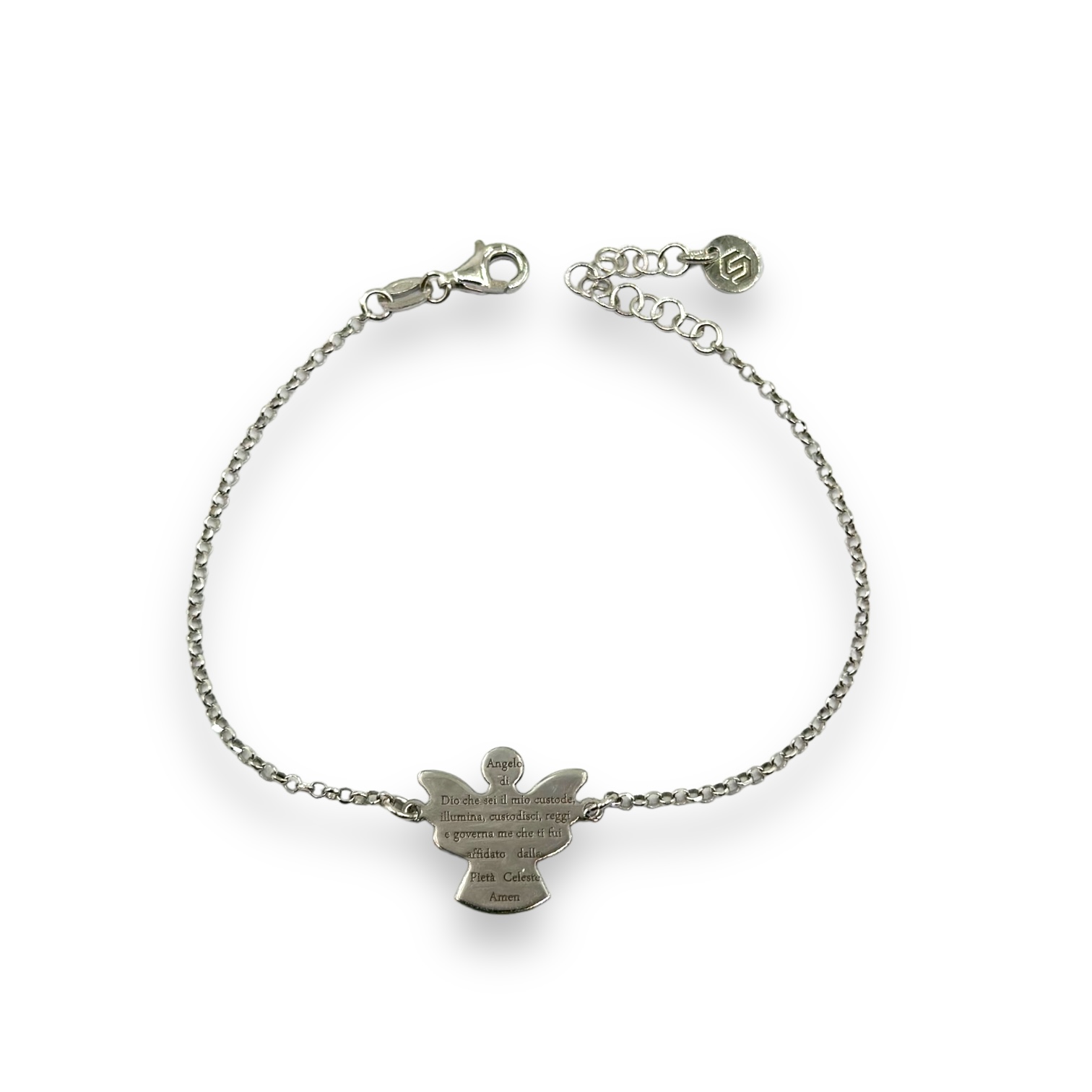 Bracciale da donna in argento 925 conn angelo centrale e preghiera incisa, chiusura a molla regolabile. Misura 17 cm + 3 cm di allungo.