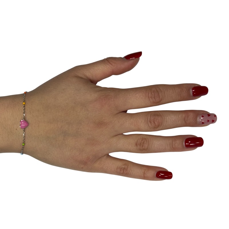 Bracciale da bambina in argento 925 con cuore bombato e pallini smalatati . Lunghezza 16 cm + 3 cm di allungo. Chiusura a moschetone regolabile