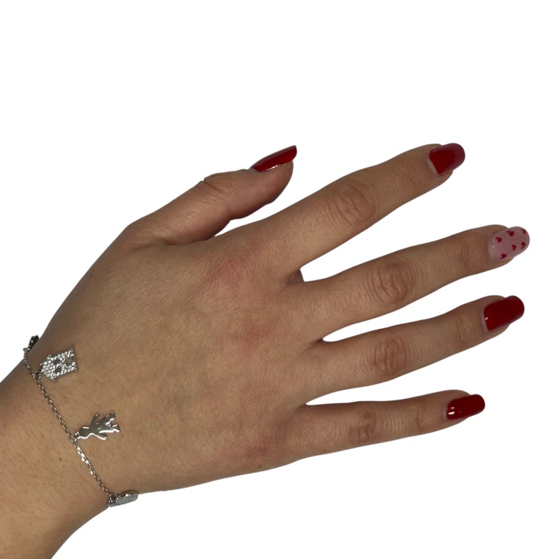 Bracciale da donna in argento 925 con 5 charms a forma di bambini, casa e cuori zirconati. Chiusura a moschettone regolabile.