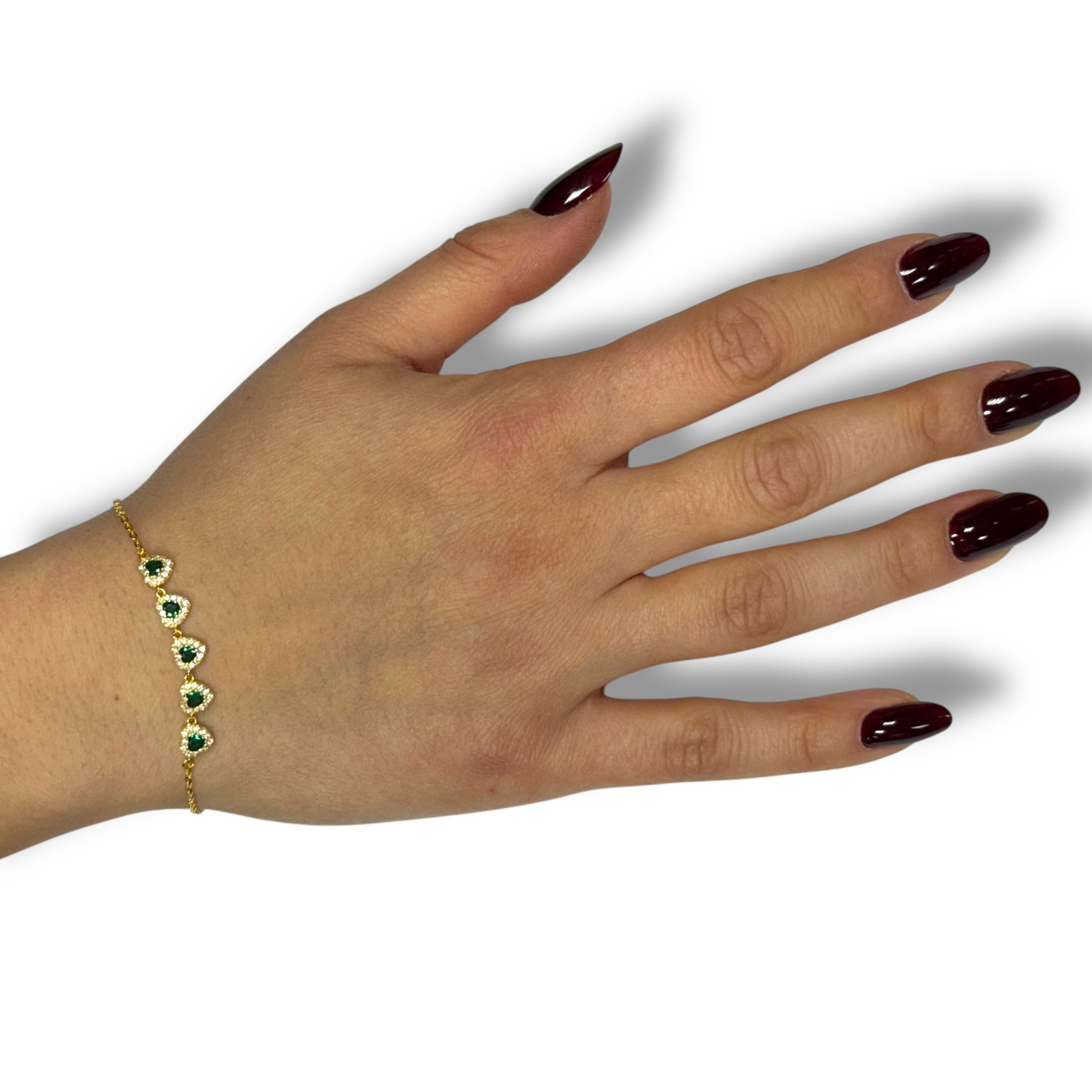 Bracciale da donna in argento 925 con 5 cuori impreziositi da zirconi colorati. Lunghezza 16cm + 3 cm di allungo. Chiusura a moschettone regolabile