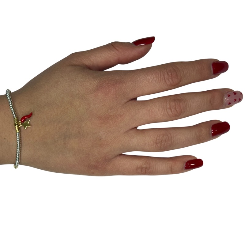 Bracciale da donna in argento 925 con anelini silver, pepite dorate e corno rosso e stellina dorata pendente . Lunghezza 16 cm + 4 cm di allungo. Chiusura a moschettone regolabile