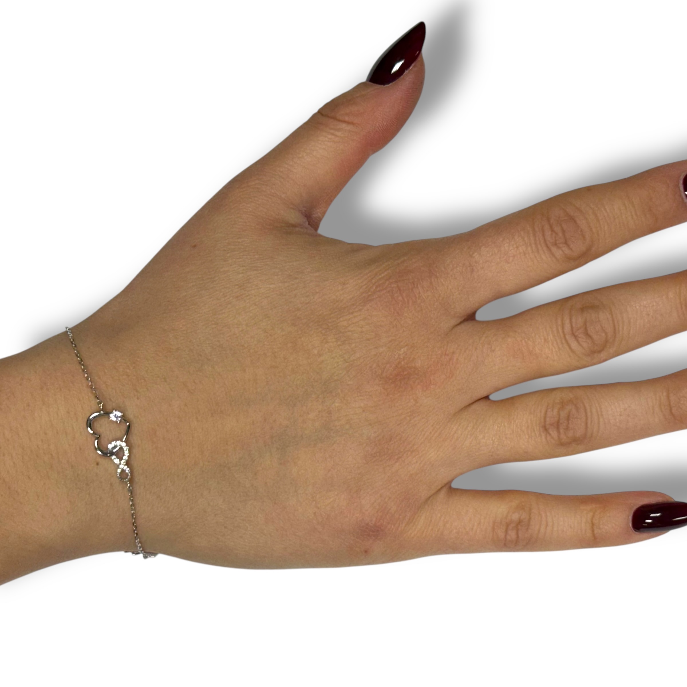 Bracciale da donna in argento 925 con cuore centrale e simbolo dell’inifito, impreziosito da un zircone. Lunghezza 16 cm + 3 cm di allungo. Chiusura a moschettone regolabile