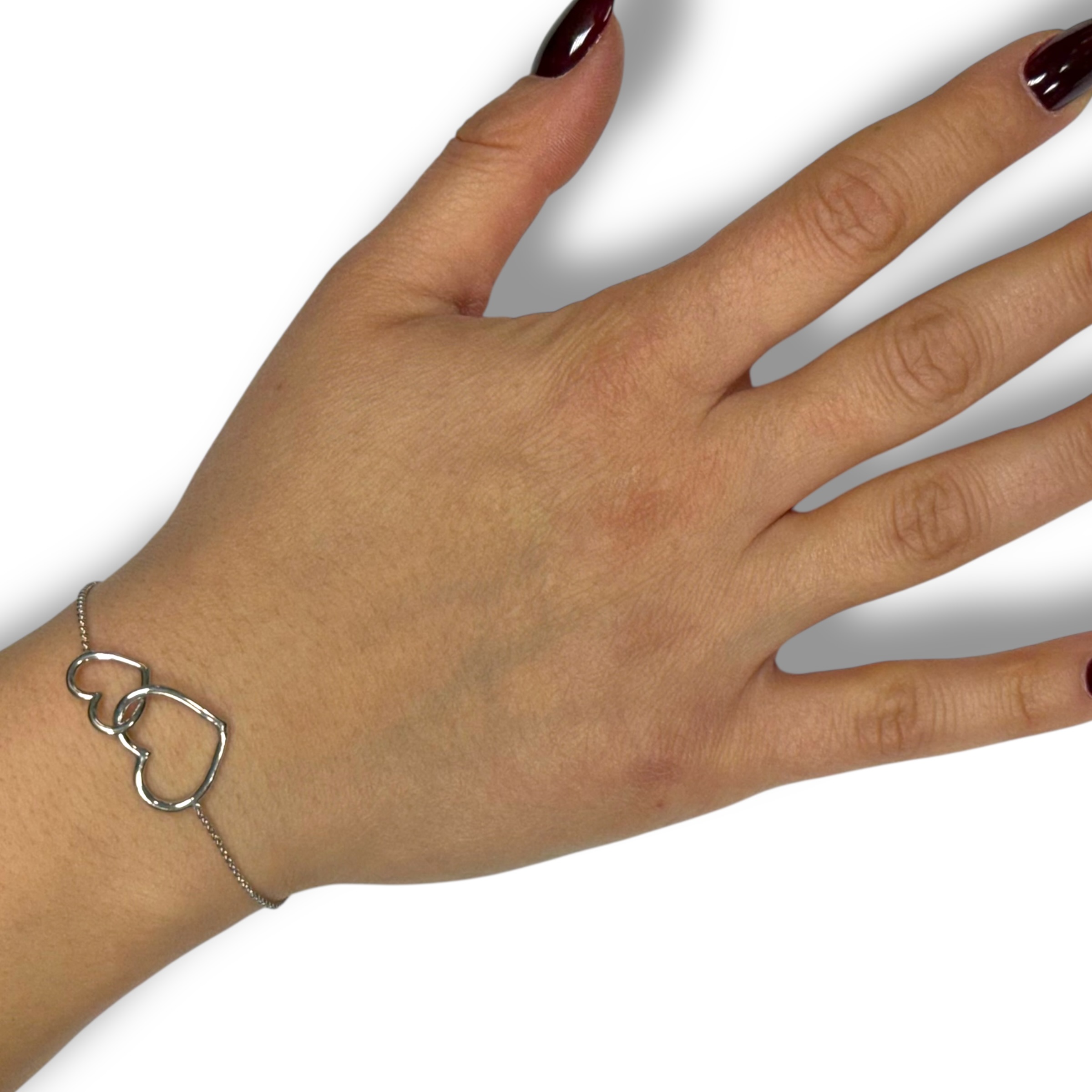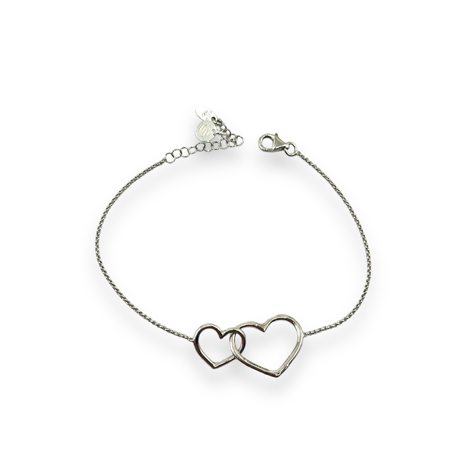 Bracciale da donna in argento 925 composto da due cuori incatenati. Misura 16 cm + 4 cm di allungo. Chiusura a moschettone regolabile