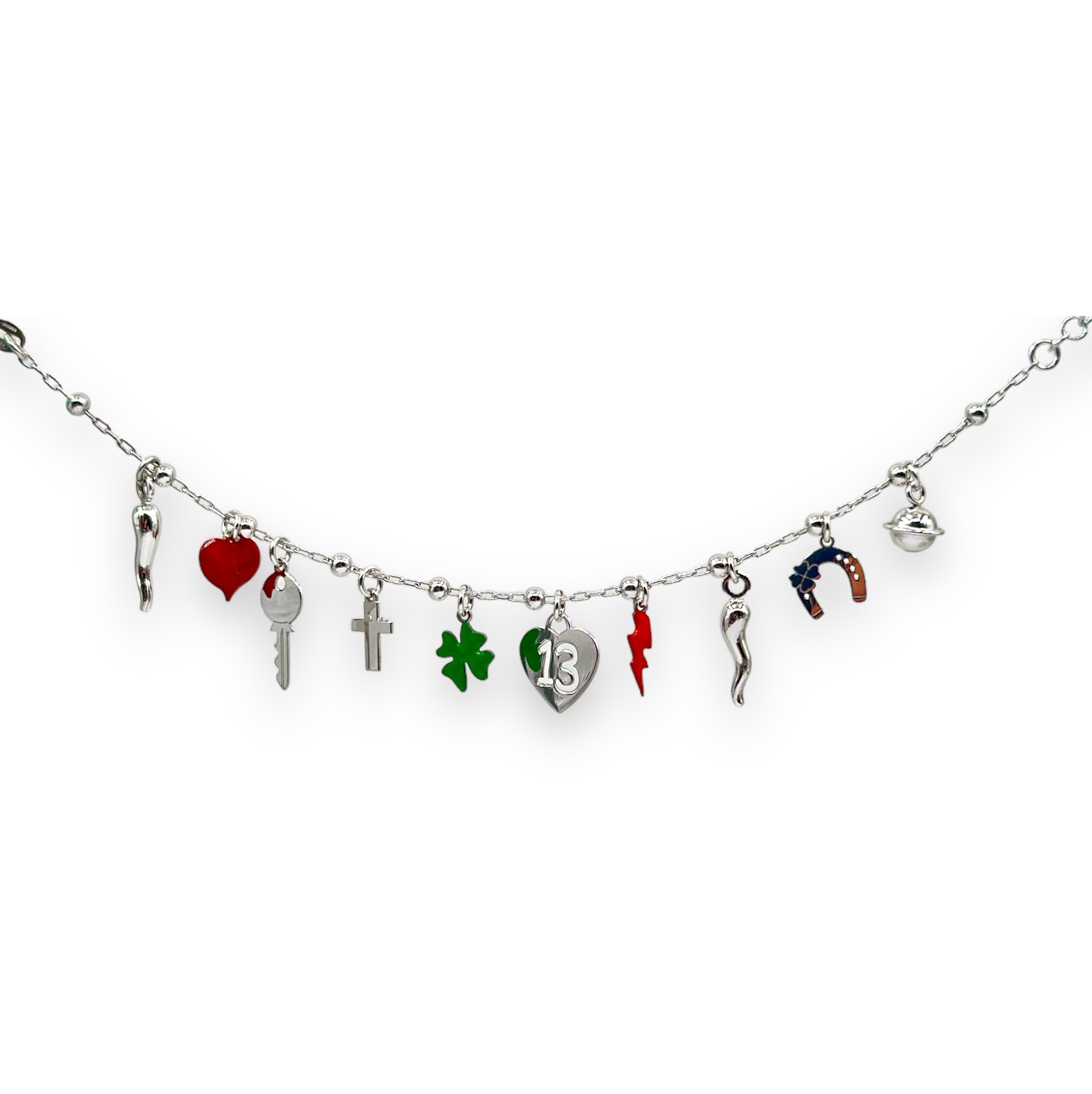 Bracciale da donna in argento 925 con charms della fortuna. Lunghezza: 16 cm +3,5 di allungo. Chiusura a moschettone regolabile