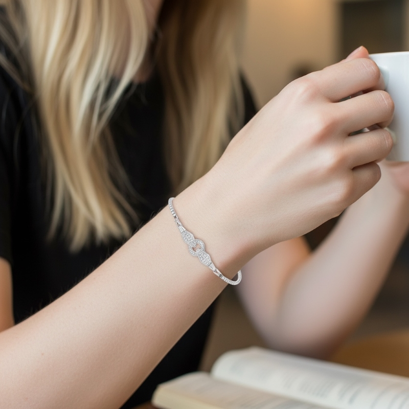 Bracciale da donna in argento 925 con doppio tennis e teste di serpente e cerchietto zirconato. Chiusura a moschettone regolabile.