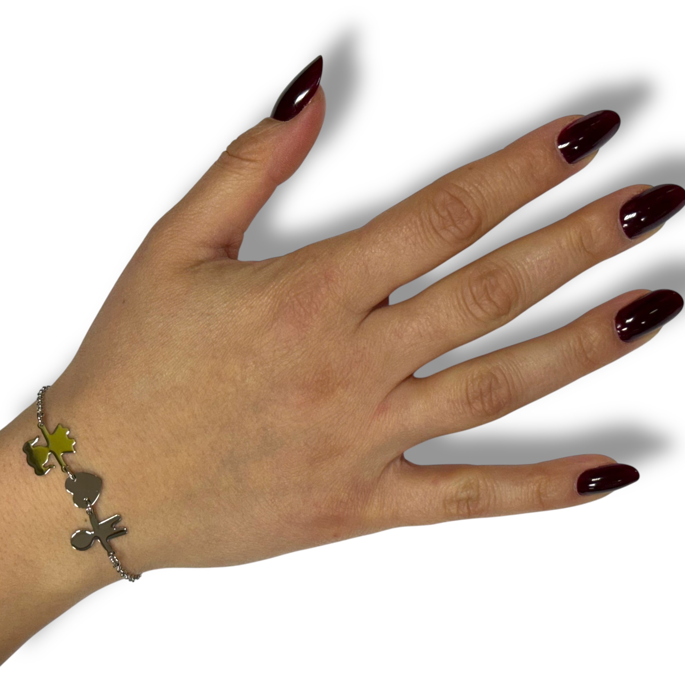 Bracciale da donna in argento 925 con soggetti a forma di bimba, cuore e bimbo. Chiusura a moschettone regolabile. Misura 17 cm + 3 cm di allungo.