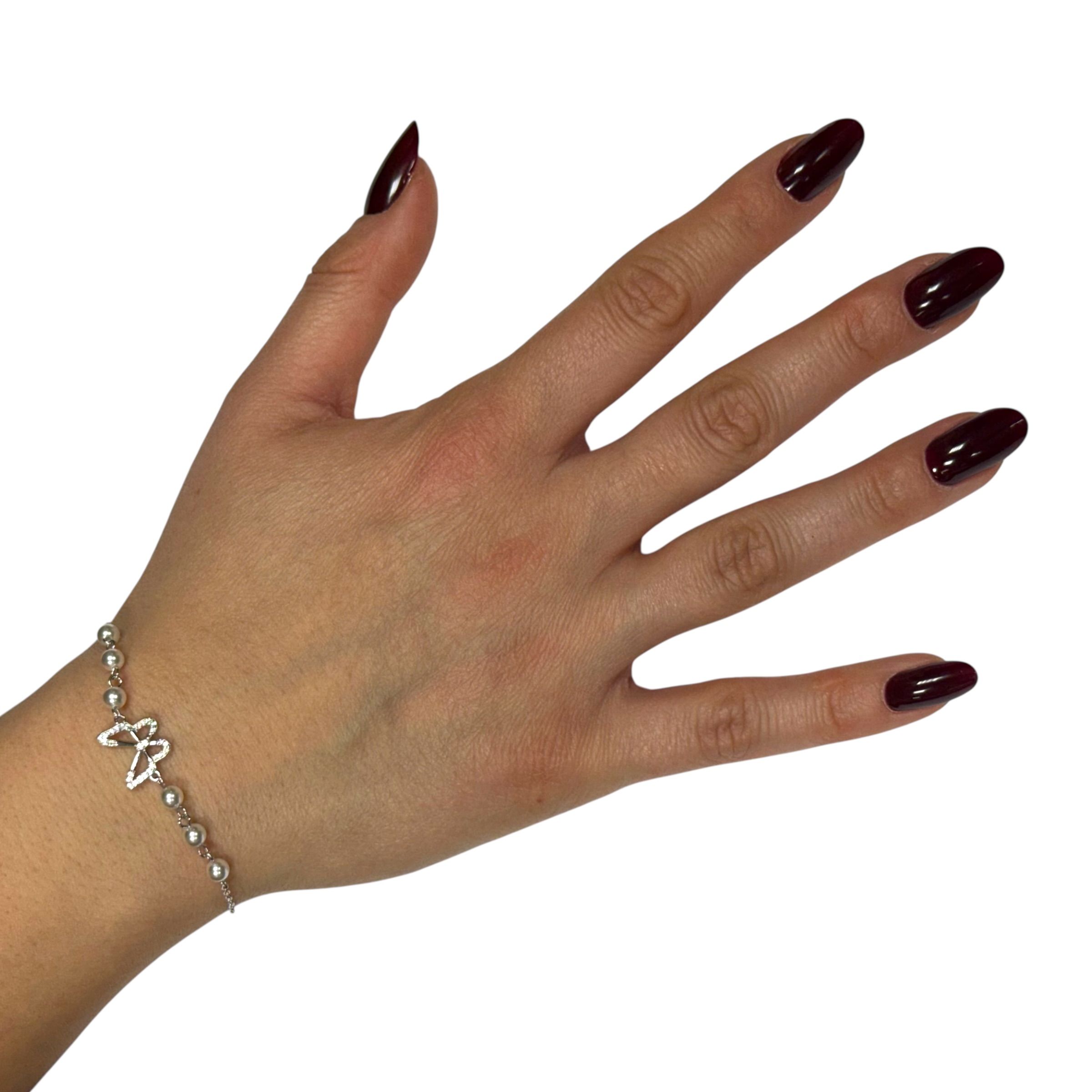 Bracciale da donna in argento 925 con farfalla centrale impreziosito da zirconi e perline. Lunghezza 16 cm +3 cm di allungo. Chiusura a moschettone regolabile