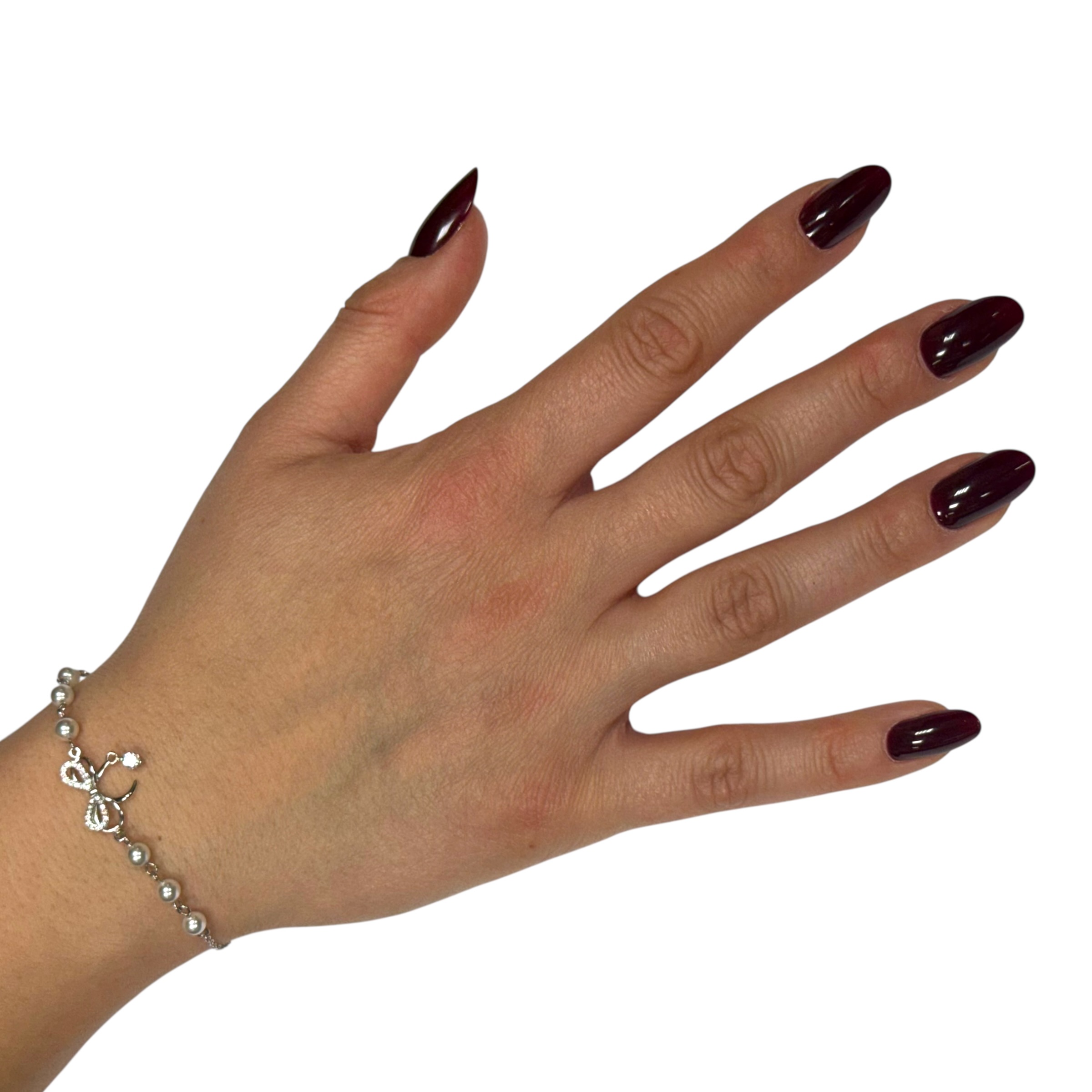 Bracciale da donna in argento 925 con fiocco centrale impreziosito da zirconi e perline. Lunghezza 16 cm +3 cm di allungo. Chiusura a moschettone regolabile