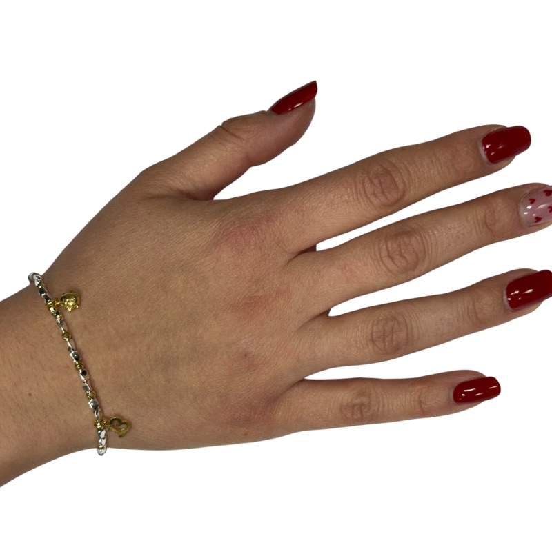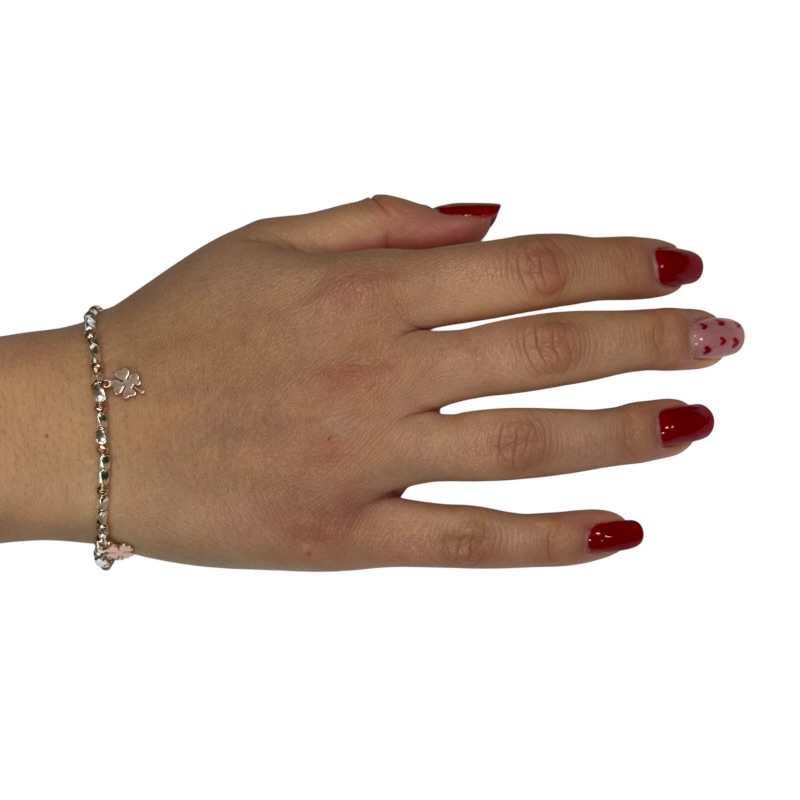 Bracciale in argento 925 con pepite e pendenti a forma della fortuna. Lunghezza 16 cm + 3 cm di allungo. Chiusura a moschettone regolabile