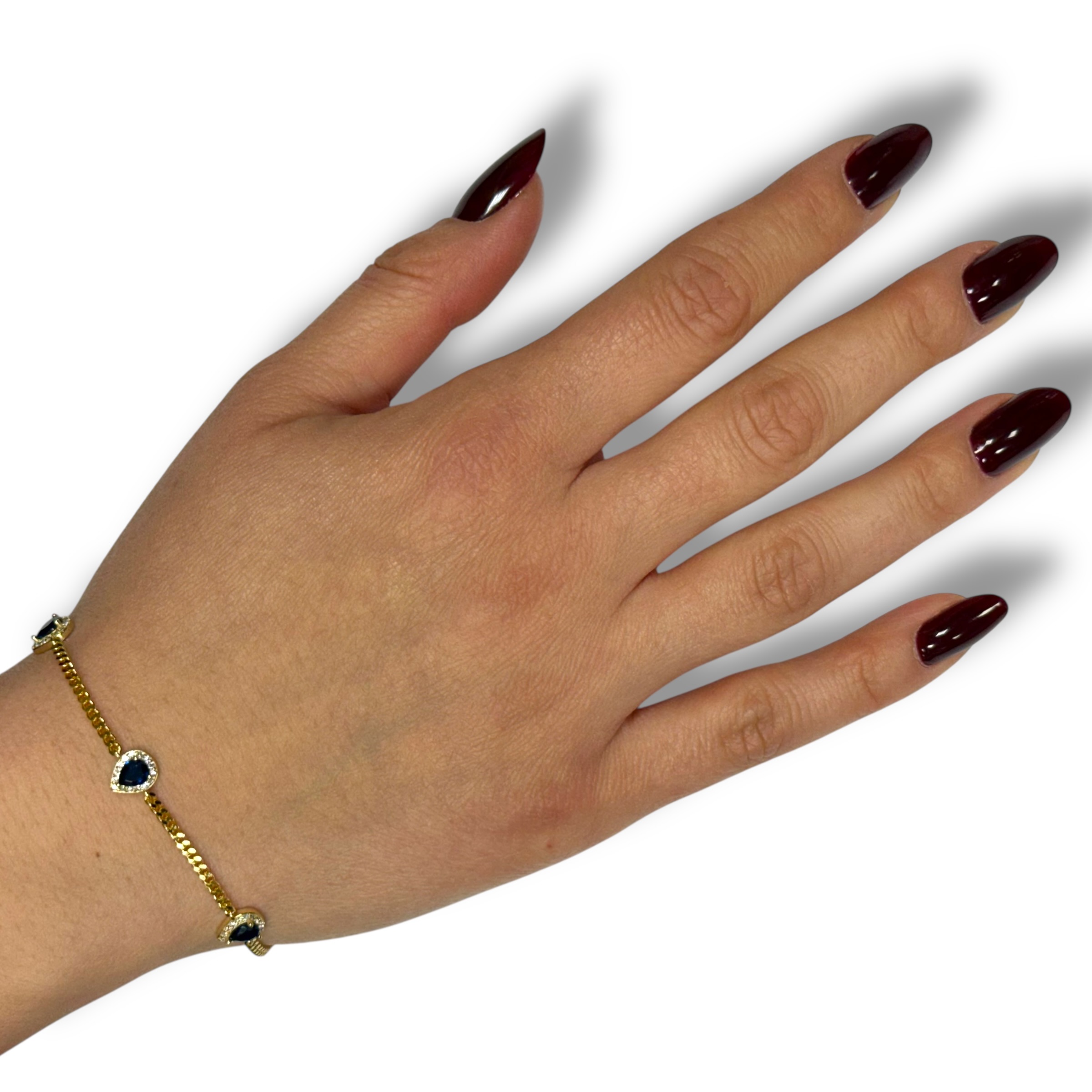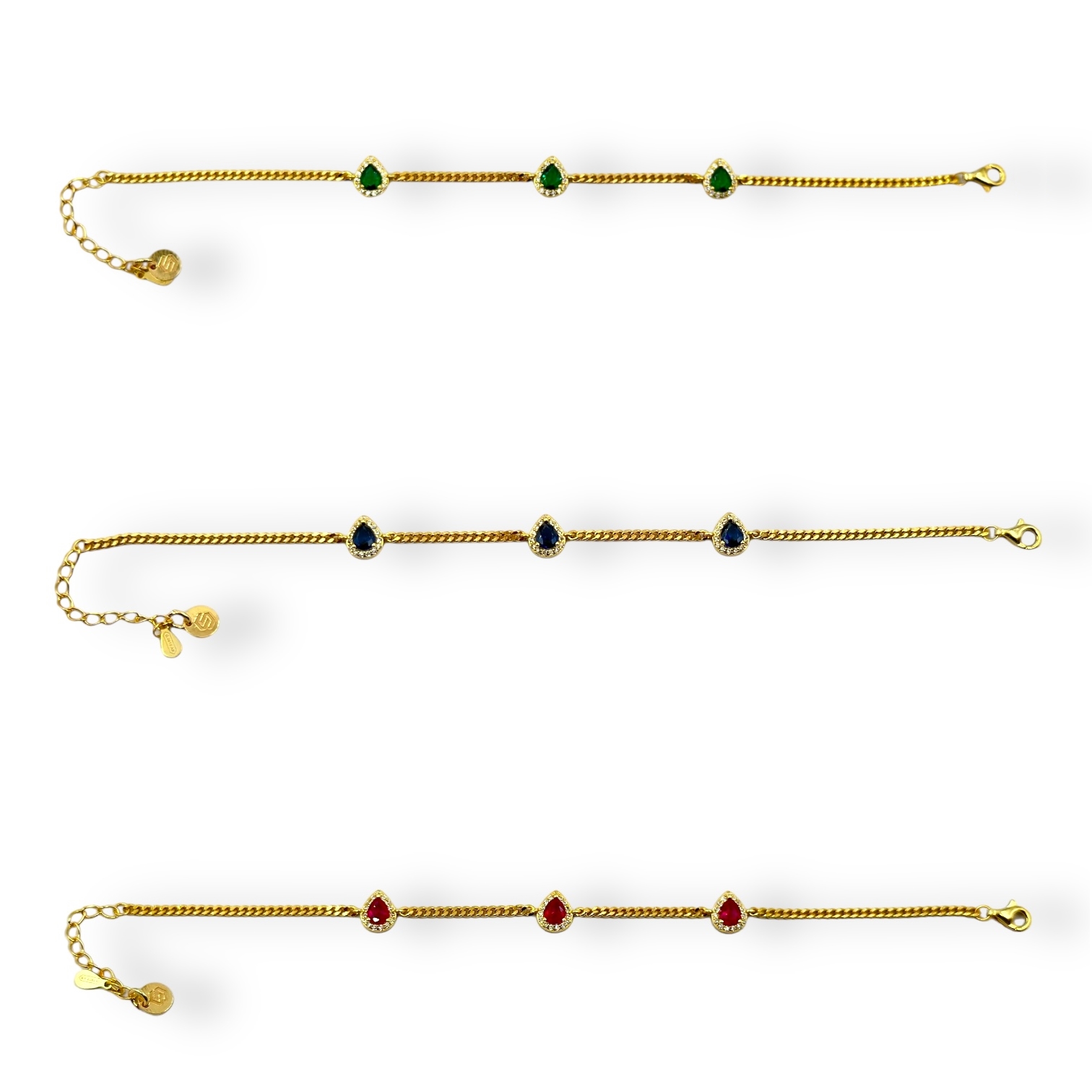 Bracciale da donna in argento 925 colore gold, composto grumette e 3 pietre impreziosite da strass, lunghezza: 16 cm + 3 cm di allungo, chiusura moschettone regolabile