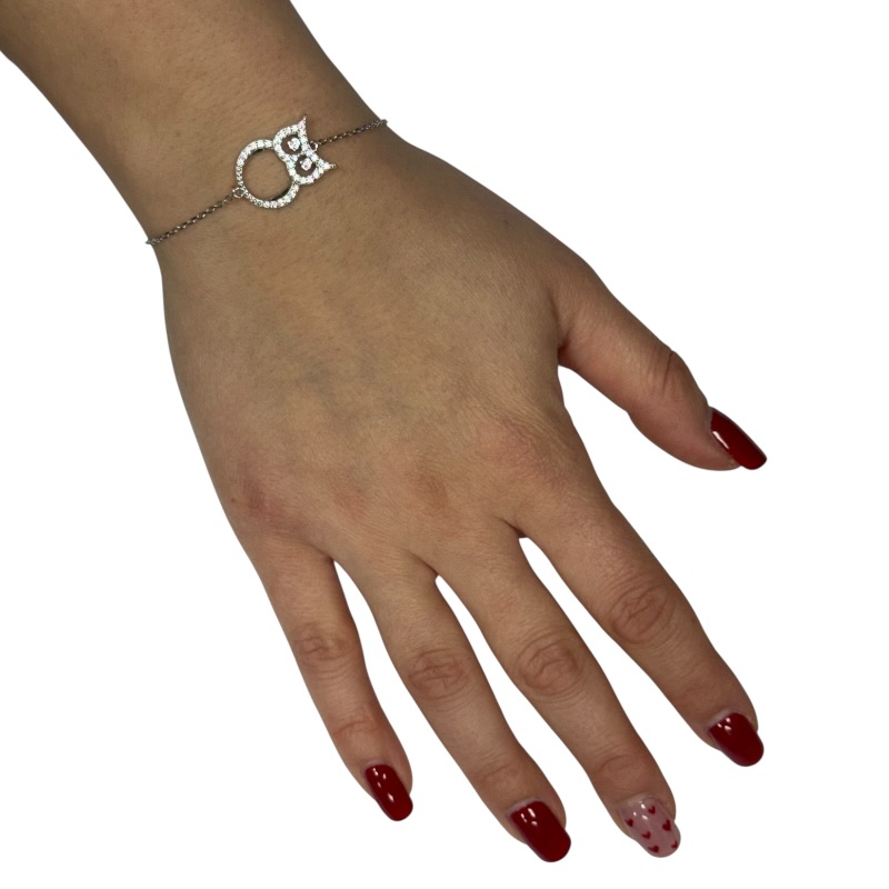 Bracciale da donna in argento 925 con gufo centrale zirconato. Chiusura a moschettone regolabile