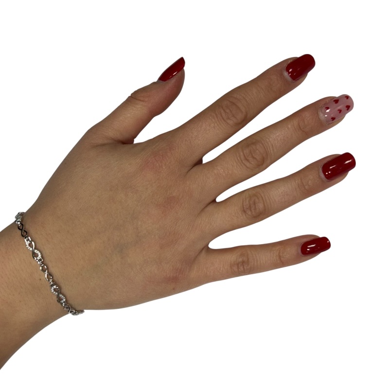 Bracciale da donna in argento 925 con simboli dell’infinito zirconati. Lunghezza 16 cm + 3 cm di allungo. Chiusura a moschettone regolabile