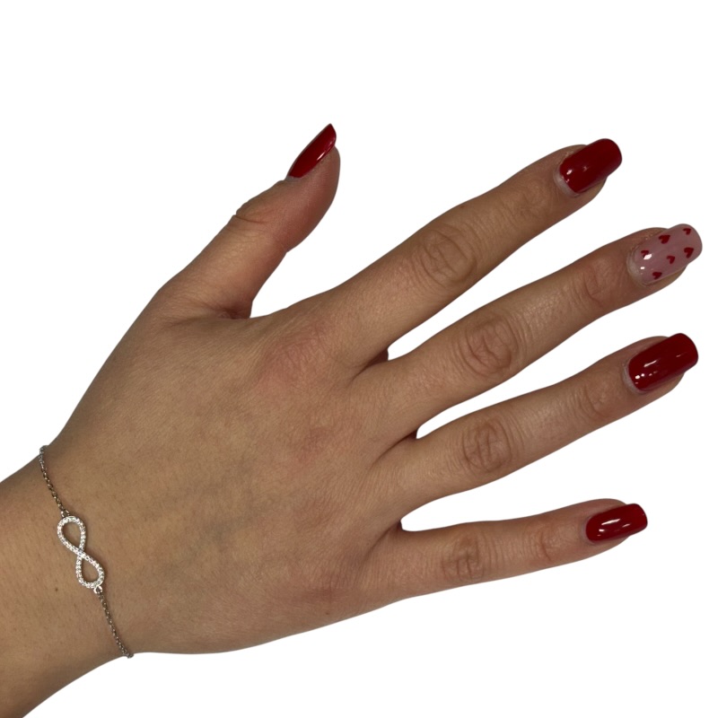 Bracciale in argento 925 con infinito centrale zirconato. Chiusura a moschettone regolabile.