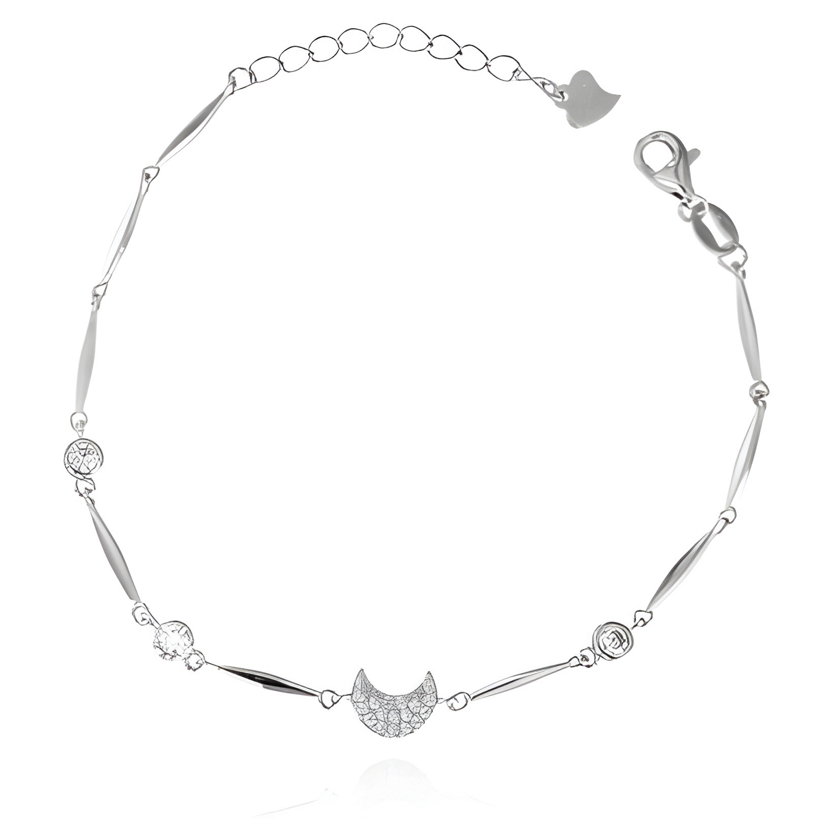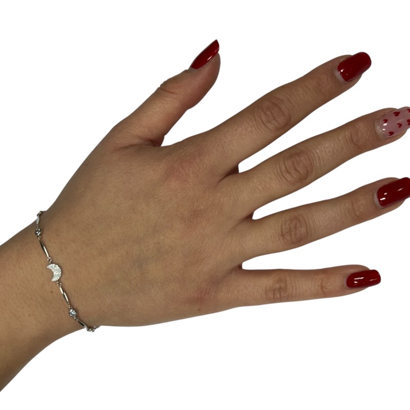 Bracciale da donna in argento 925, modello semirigido con cipollini e luna. Chiusura a moschettone regolabile. Lunghezza: 16 cm + 3 cm di allungo
