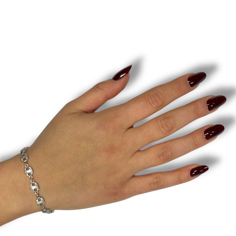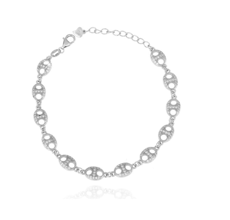 Bracciale da donna in argento 925 con catena maglia marinara impreziosito da zirconi. Lunghezza 16 cm + 3 cm di allungo. Chiusura a moschettone regolabile