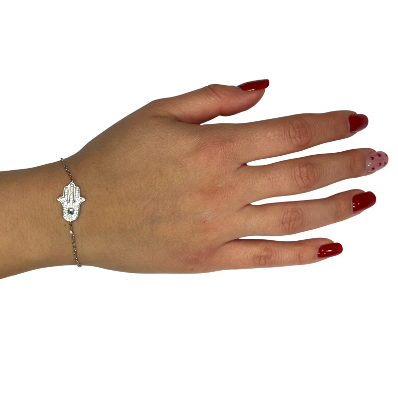 Bracciale da donna in argento 925 ,con mano di fatima centrale impreziosita da zirconi. Lunghezza 16 cm + 3 cm di allungo. Chiusura a moschettone regolabile.