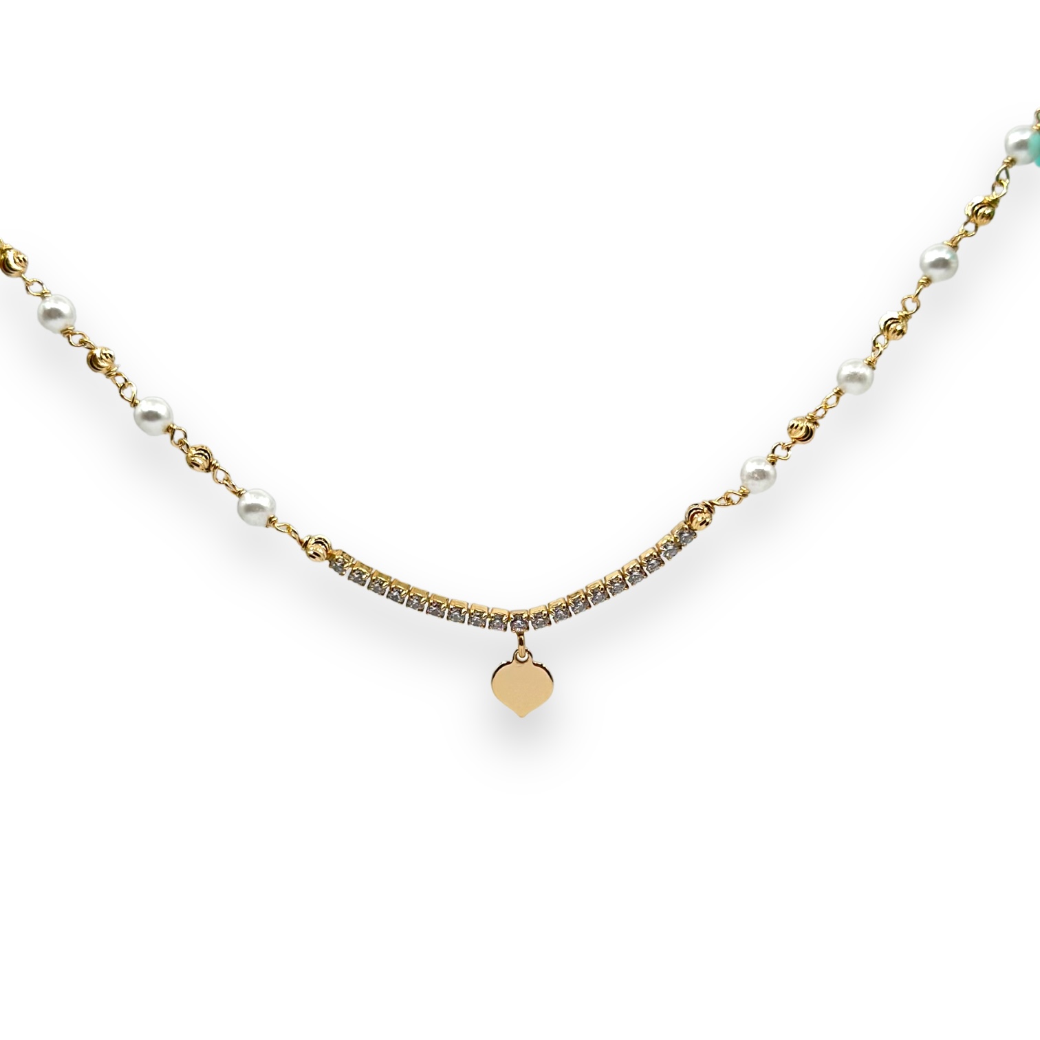 Bracciale da donna in argento 925, colore gold composto da mezzo tennis e perline alternate con sfere zigrinate e charms centrale a forma di cuore. Chiusura a moschettone regolabile. Misura 16 cm + 3,5 cm di allungo.