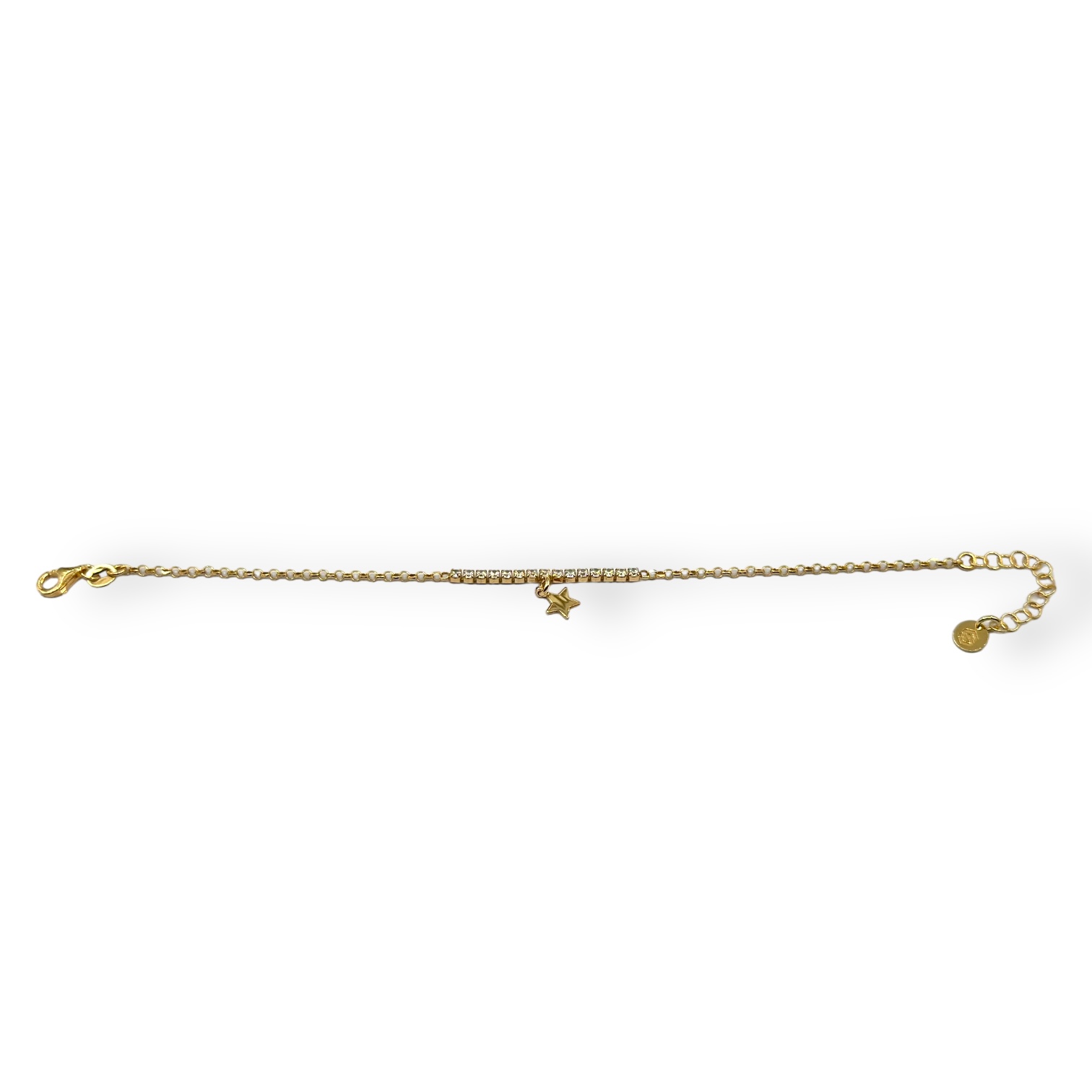 Bracciale da donna in argento 925 colore gold con catelina e tennis centrale con stellina pendente. Chiusura a moschettone regolabile. Misura 16,5 cm + 3,5 cm di allungo.