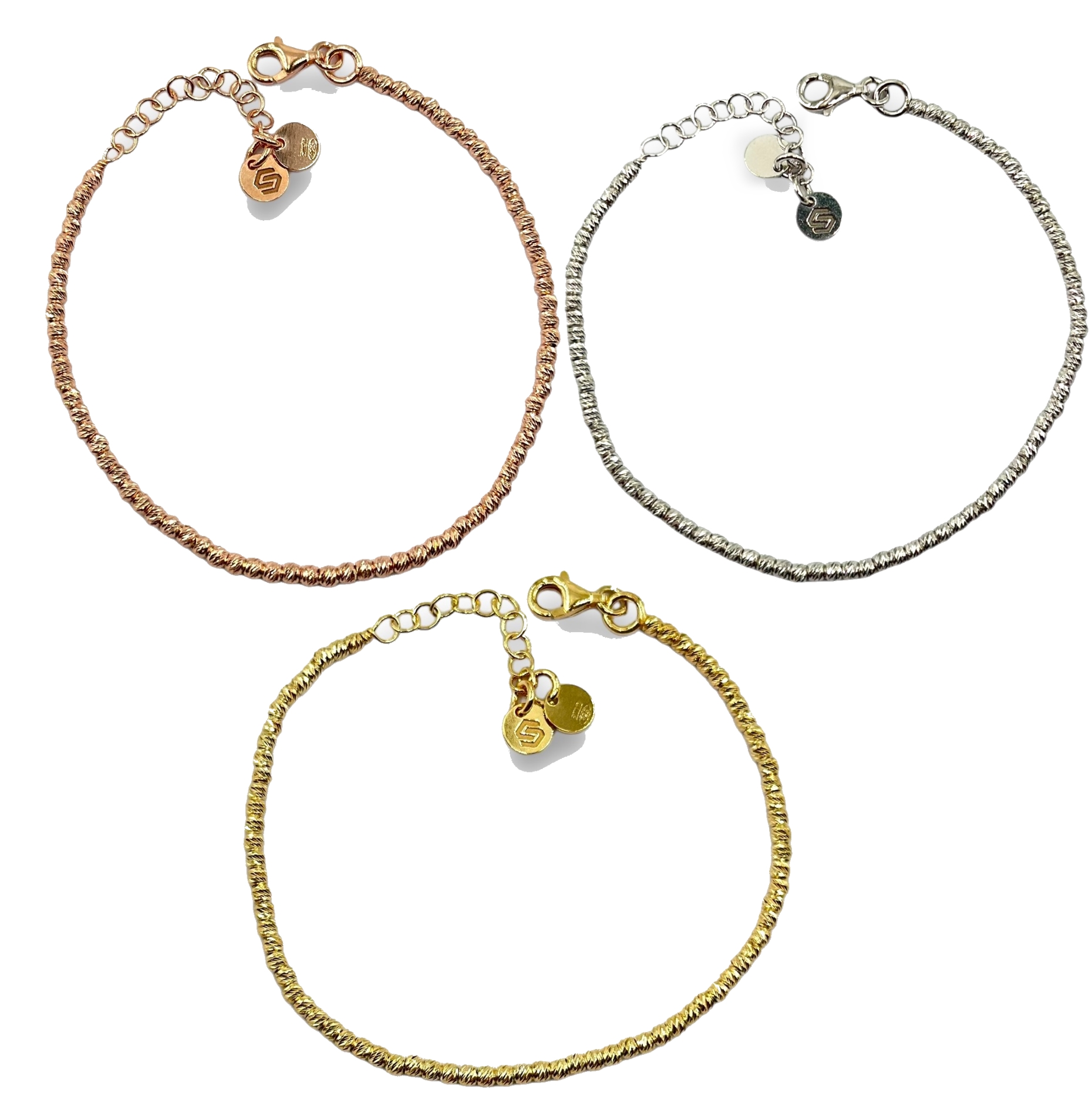 Bracciale da donna in argento 925 colore gold, composto da palline luminose spesse 2,5 mm, lunghezza: 16 cm + 3 cm di allungo, chiusura moschettone regolabile