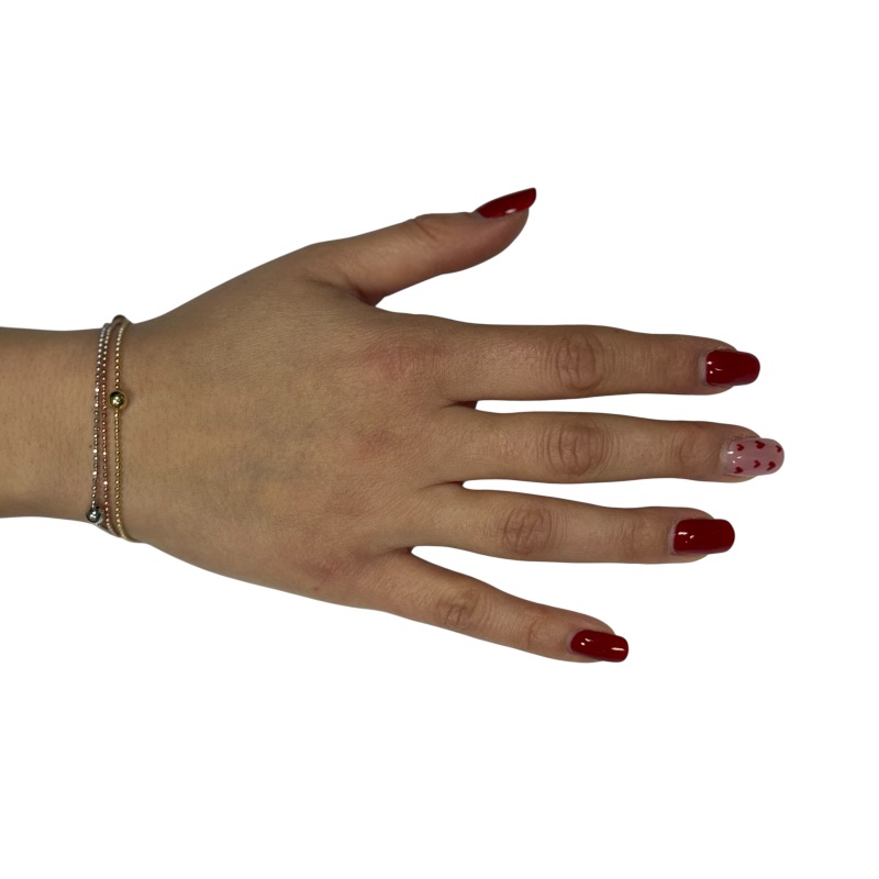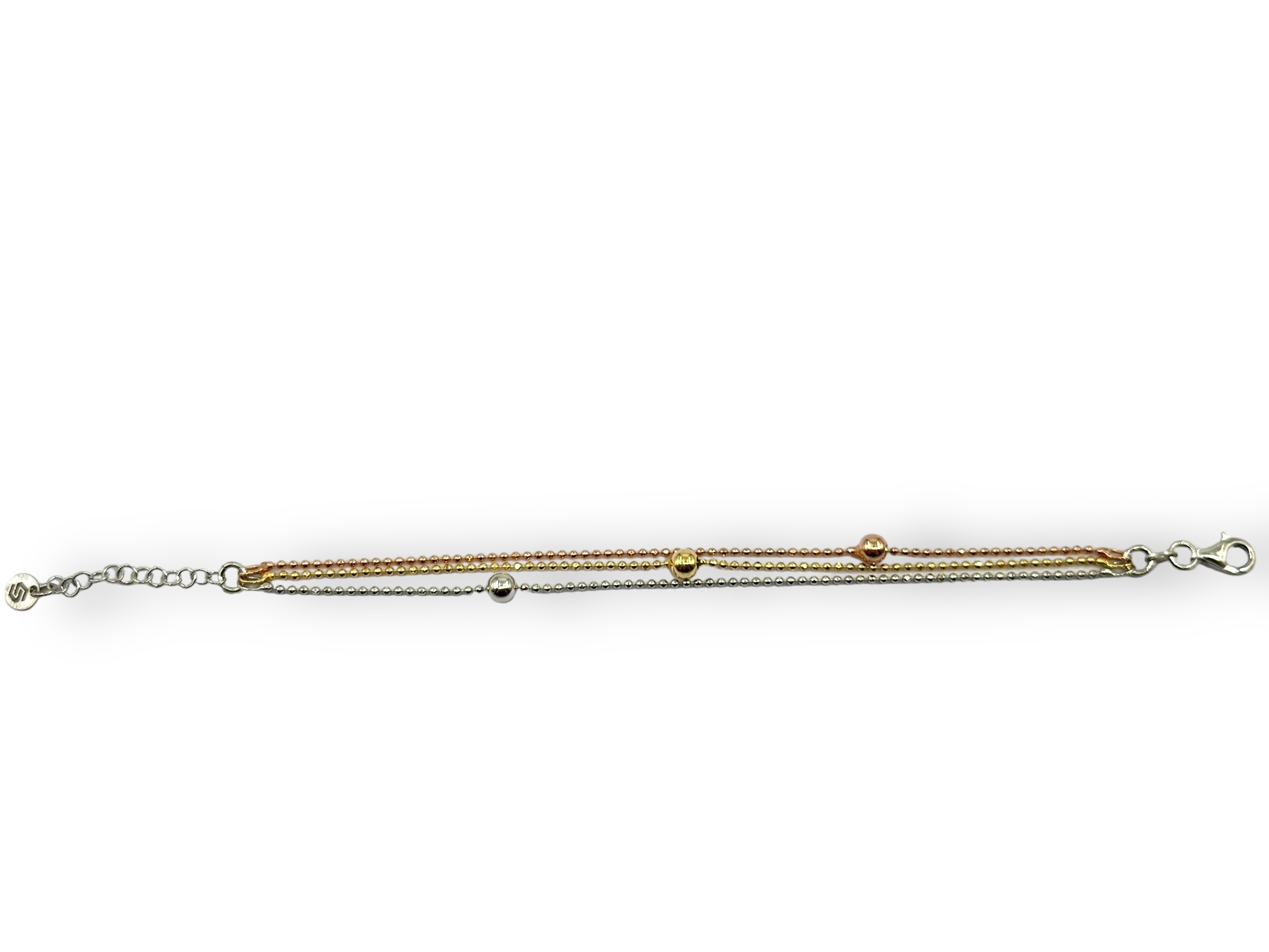 Bracciale da donna in argento 925 colore silver, gold e gold rose, maglia pallinata, con 3 sfere, chisura moschettone regolabile, misura: 16 cm + 3 cm allungo