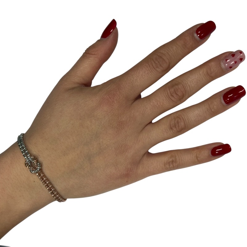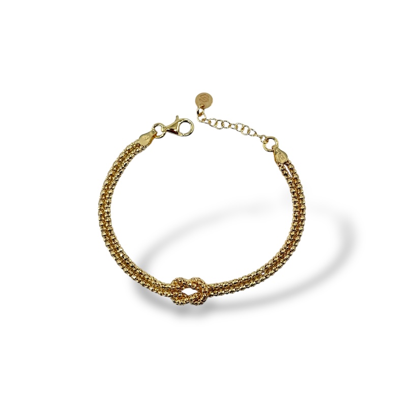 Bracciale in argento 925 con nodo centrale. Lunghezza 16 cm + 3 cm di allungo. Chiusura a moschettone regolabile.