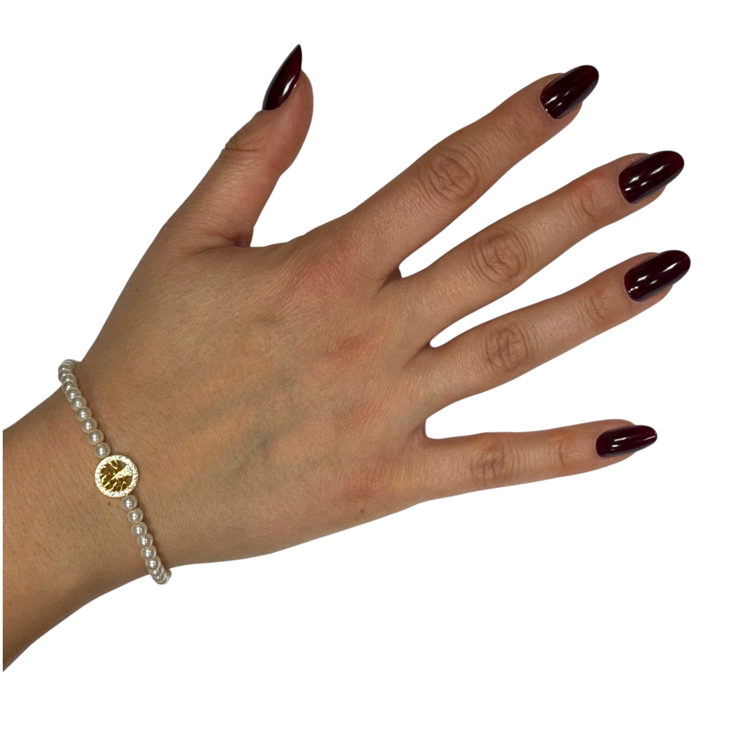 Bracciale da donna in argento 925 con perle e albero della vita centrale zirconato. Chiusura a moschettone regolabile. Lunghezza 17 cm + 3 cm di allungo