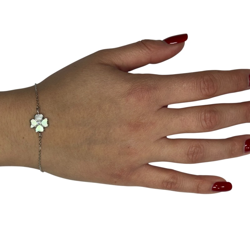 Bracciale da donna in argento 925 con quadrifioglio centrale madreperlato impreziosito da zircone centrale. Chiusura a moschettone regolabile
