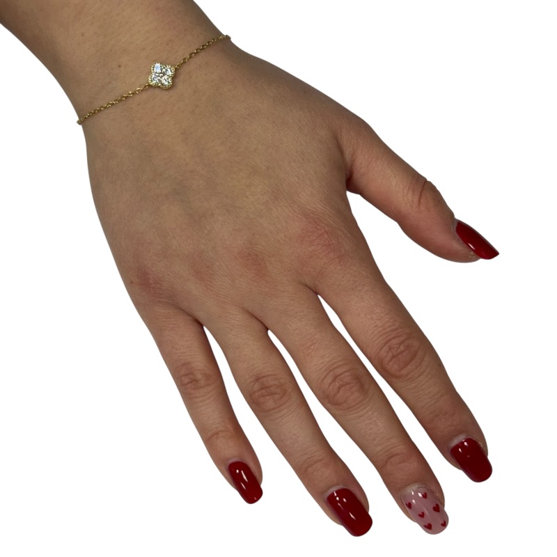 Bracciale da donna con quadrifoglio centrale impreziosito da zirconi lunghezza 16 cm + 3 cm di allungo. Chiusura a moschettone regolabile.