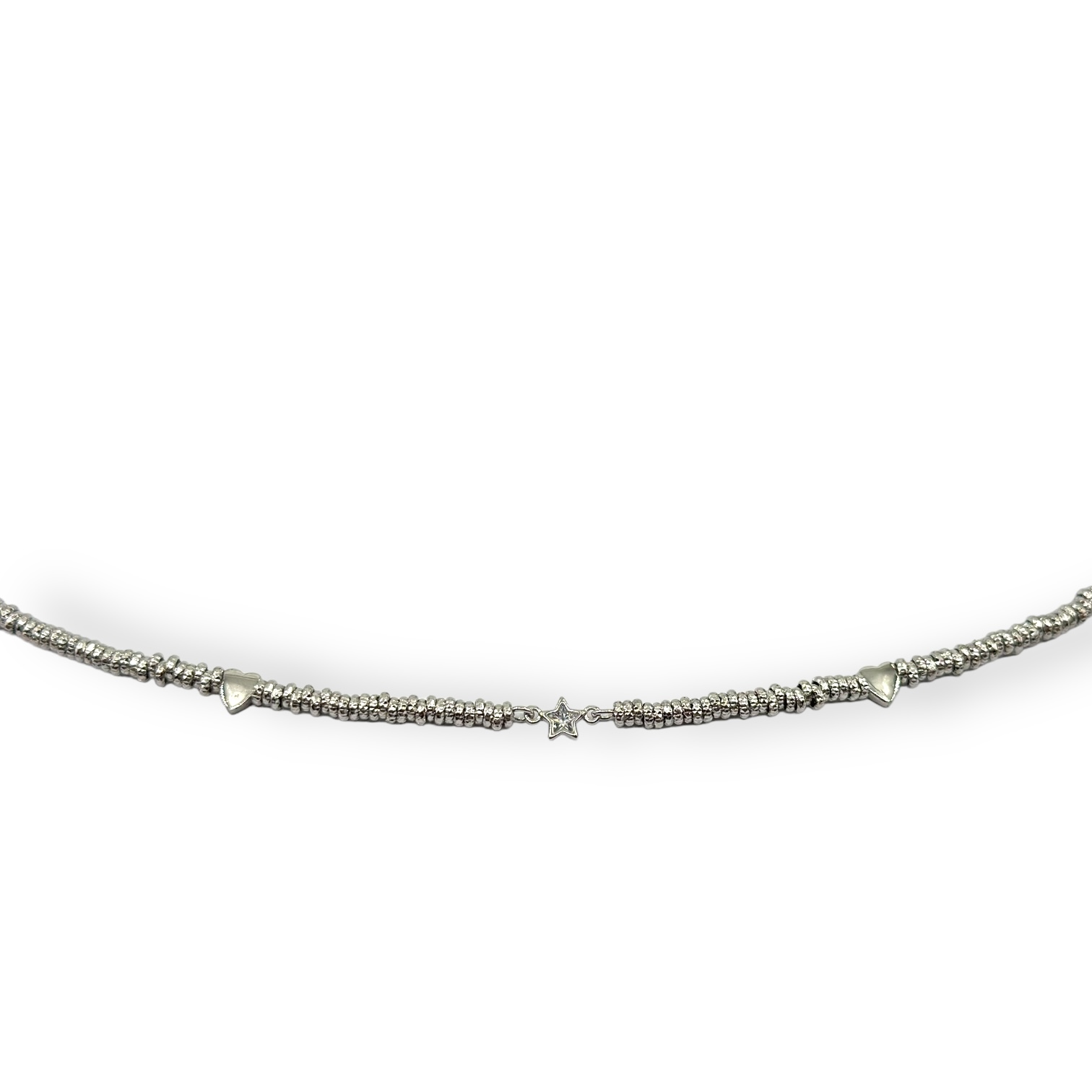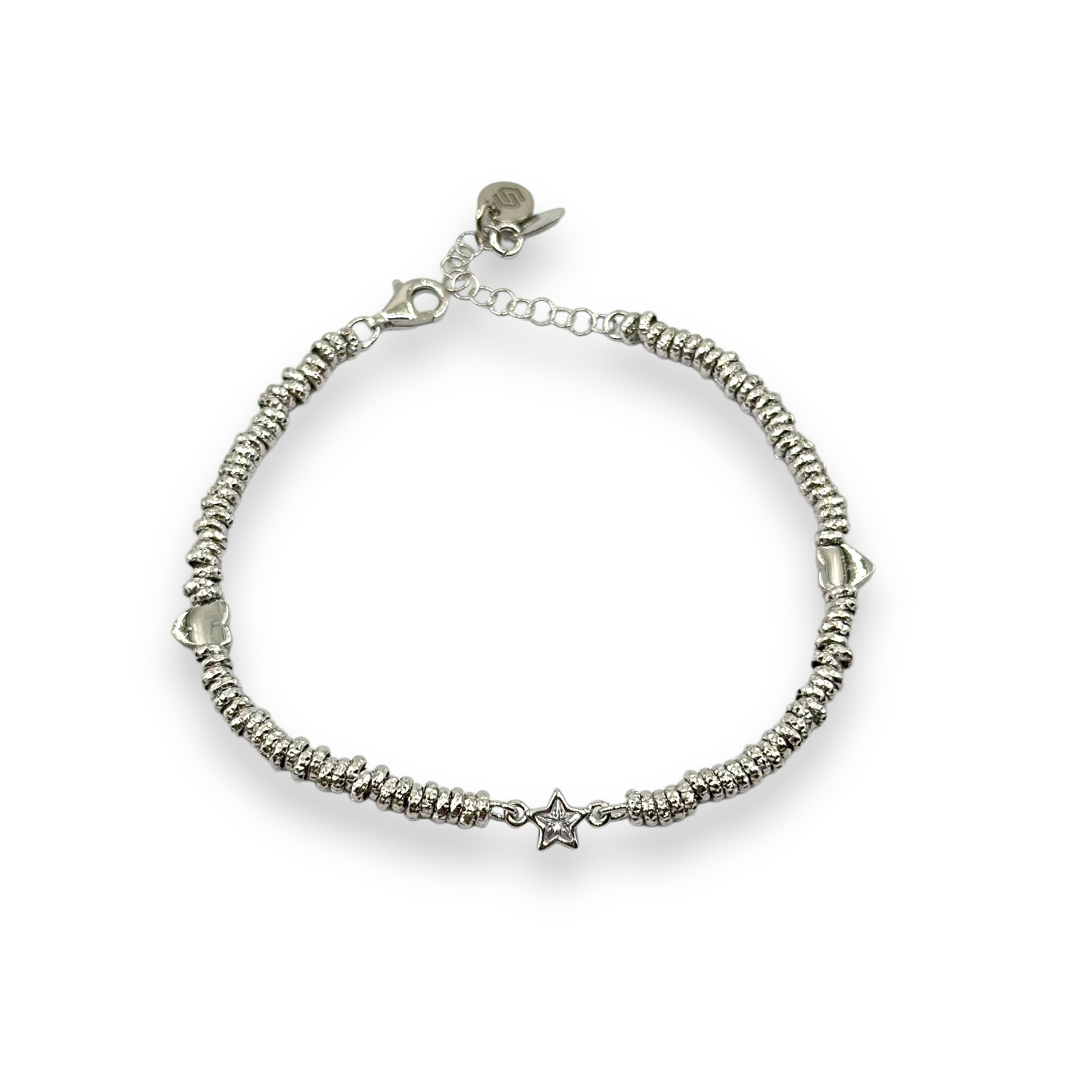 Bracciale da donna in argento 925 composto da rondelle martellate con cuoricini e stellina. Chiusura a moschettone regolabile. Misura 17 cm + 3 cm di allungo.