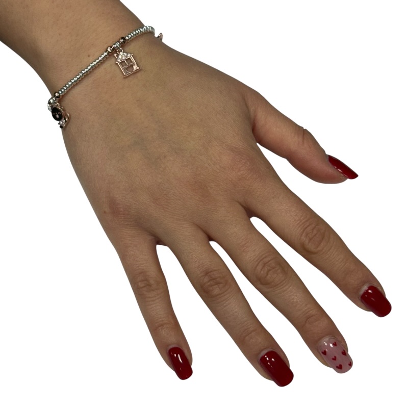 Bracciale da donna in argento 925 composto da ronelle spesse 2,5mm e charms a forma di casetta e gattino impreziositi da strass . Chiusura a moschettone regolabile. Misura 17 cm + 3 cm di allungo.