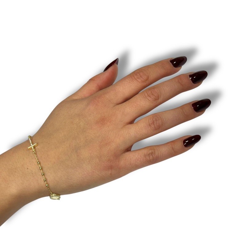 Bracciale da donna in argento 925 Rosario con palline, croce e medaglia. Lunghezza 16 cm + 3 cm di allungo. Chiusura a moschettone regolabile