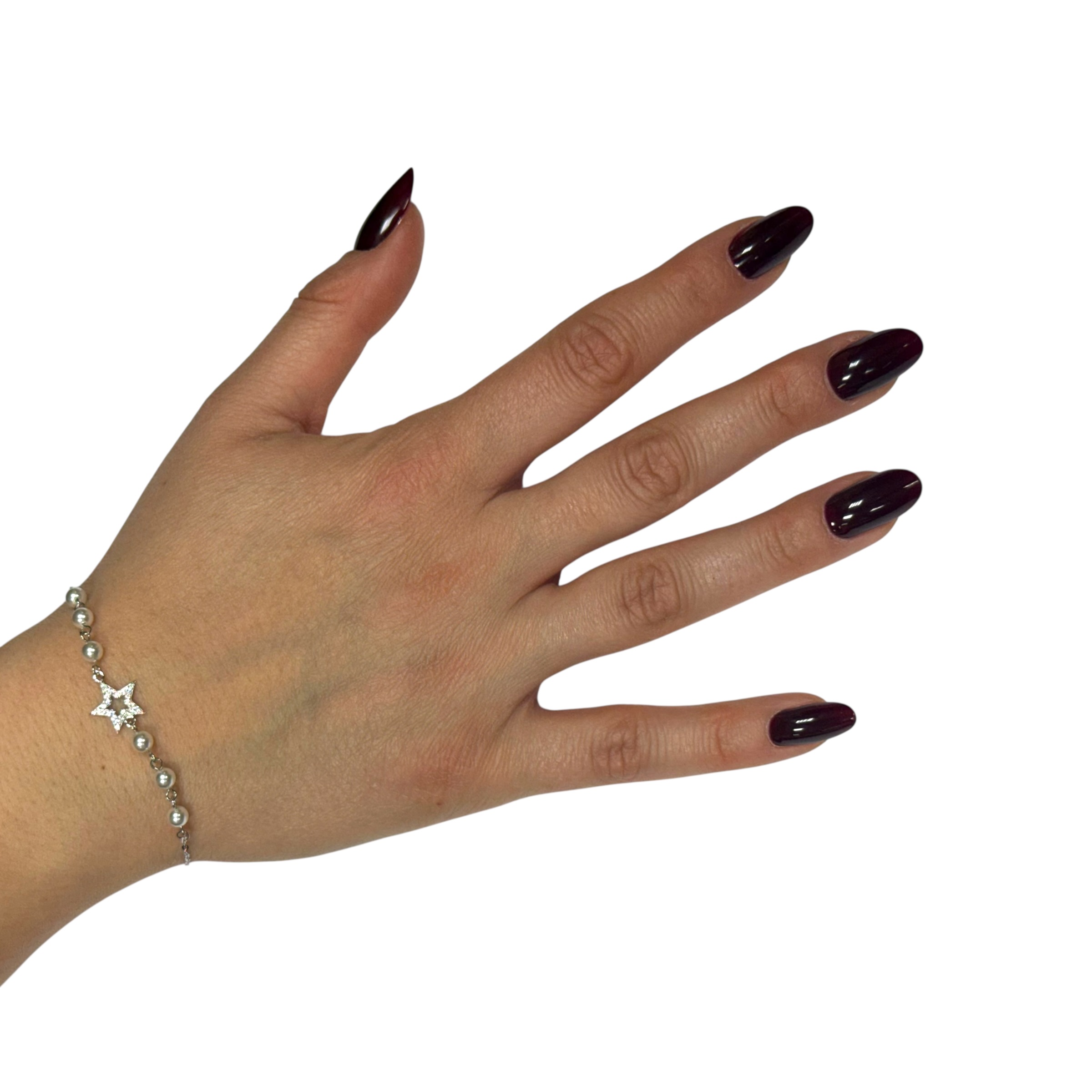 Bracciale da donna in argento 925 con stella centrale impreziosito da zirconi e perline. Lunghezza 16 cm +3 cm di allungo. Chiusura a moschettone regolabile