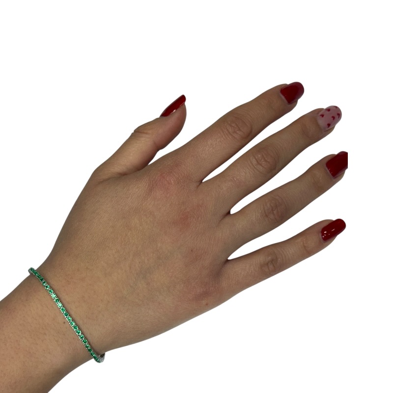 Bracciale femminile in argento 925 modello tennis con zirconi verdi. Lunghezza 16 cm, zirconi da 2 mm. Chiusura a cassetto.