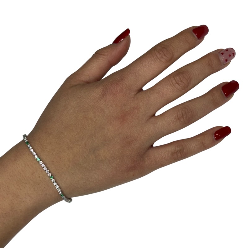 Bracciale da donna in argento 925 modello tennis con cinque bianche da 2 mm alternati ad uno verde. Lunghezza 18 cm