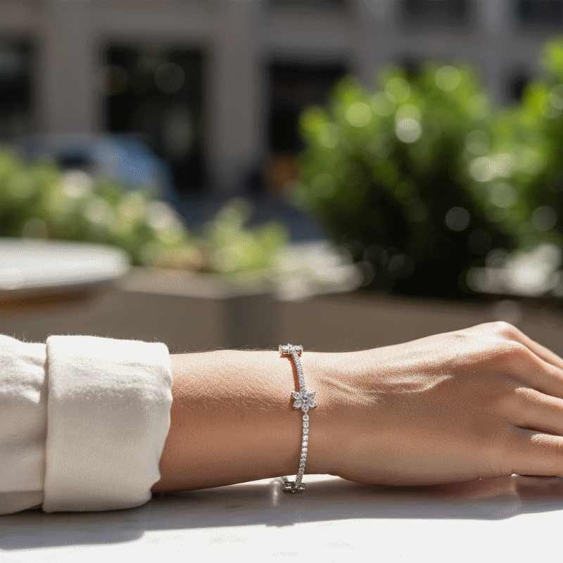Bracciale femminile in argento 925 modello tennis con 3 fiori zirconati e pistillo puntinato. Chiusura a moschettone regolabile