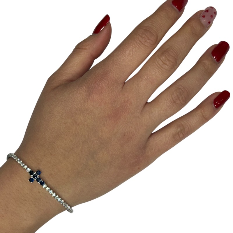 Bracciale da donna in argento 925 modello tennis con croce centrale impreziosita da zirconi colorati. Lunghezza 16 cm + 3 cm di allungo. Chiusura a moschettone regolabile
