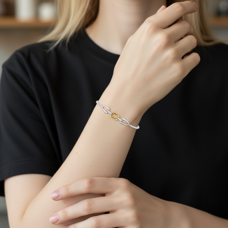 Bracciali da donna in argento 925 modello tennis con inserti dorati. Chiusura a moschettone regolabile