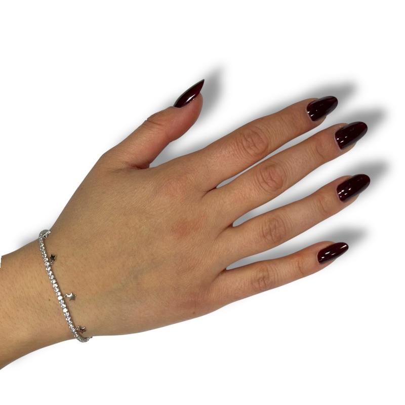 Bracciale da donna in argento 925 composto da catena tennis e stelline pendenti. Chiusura a moschettone regolaabile. Spessore pietre 1,75 . lunghezza16 cm + 3 cm di allungo.