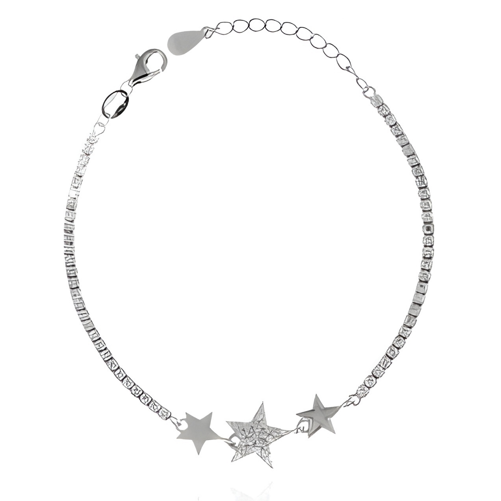 Bracciale da donna in argento 925 composto da maglia a strass e due stelle lisce. Chiusura a moschettone regolabile