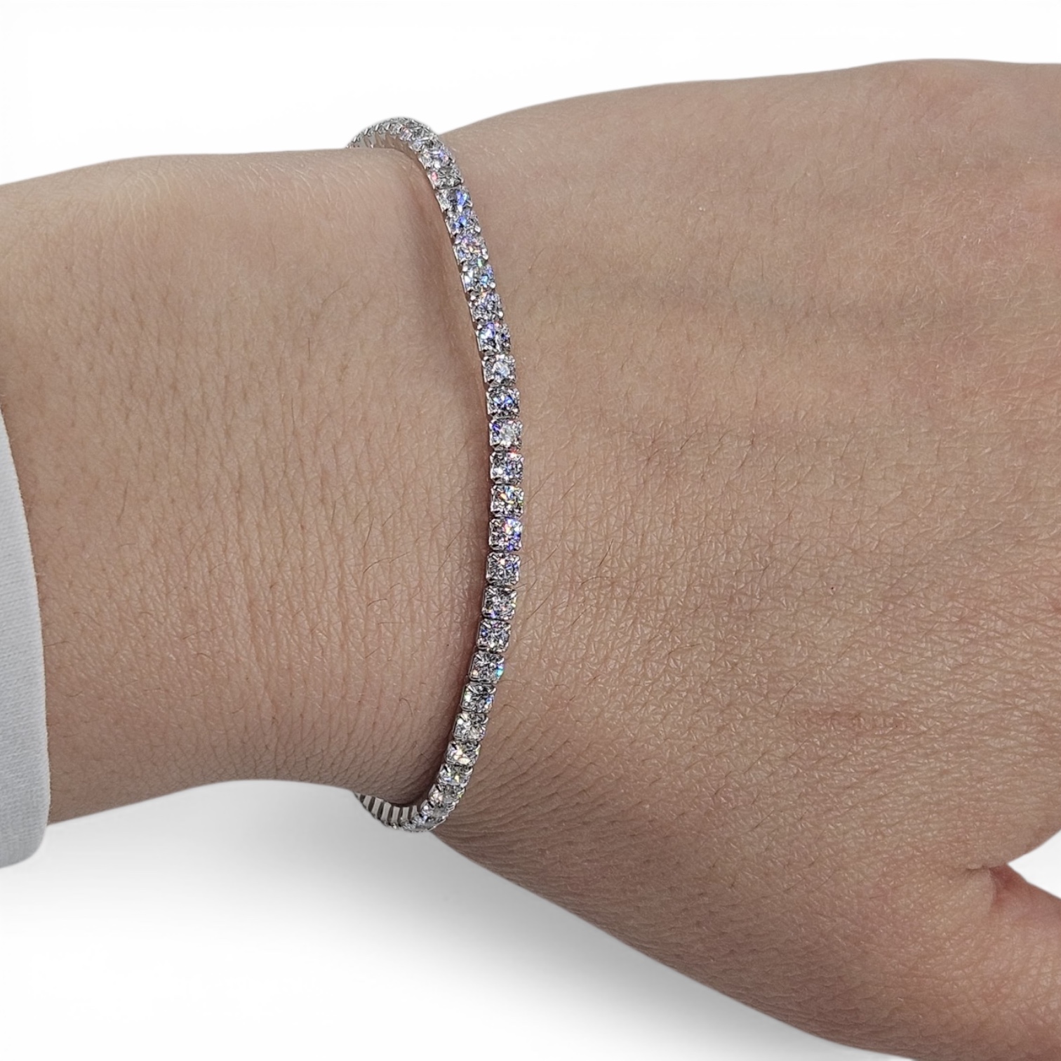 Bracciale da donna in argento 925 modello tennis con zirconi bianchi da 2,5 mm . Lunghezza 16 cm + 3 cm di allungo. Chiusura a moschettone regolabile
