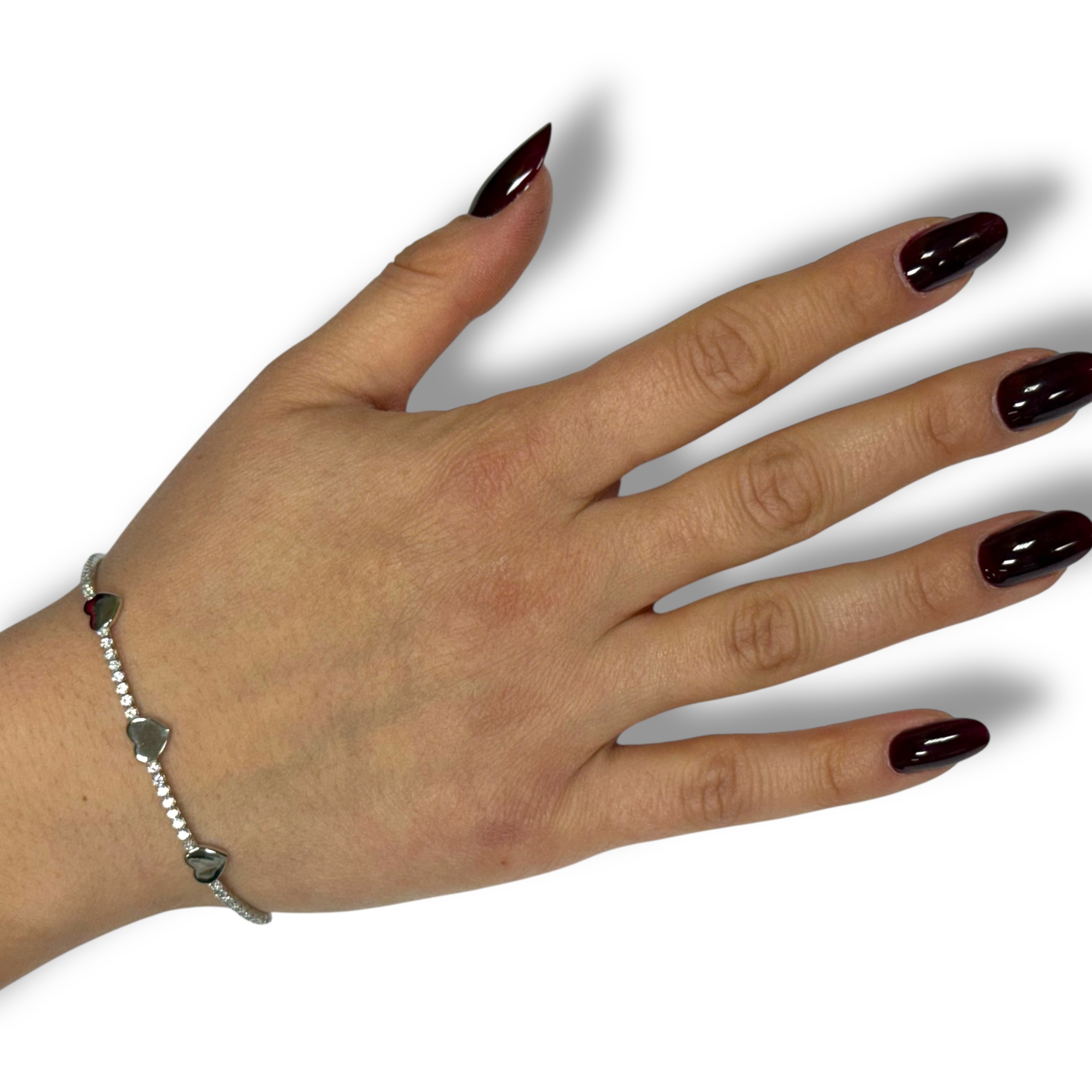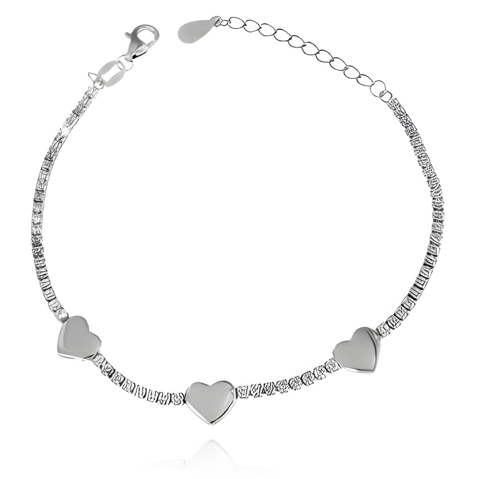Bracciale da donna in argento 925 con zirconi e cuori lisci. Misura 16 cm + 3 cm di allungo. Chiusura a moschettone regolabile