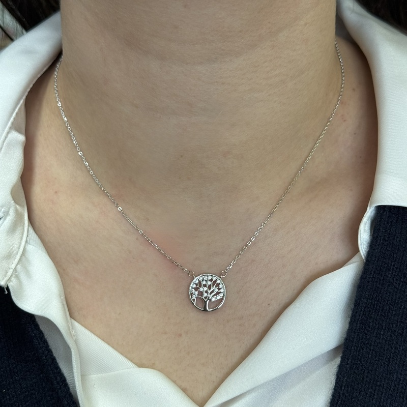 Collana da donna in argento 925 con pendente a forma di albero della vita impreziosito da zirconi. Lughezza 42 cm + 3 cm di allungo. Chiusura a moschettone regolabile