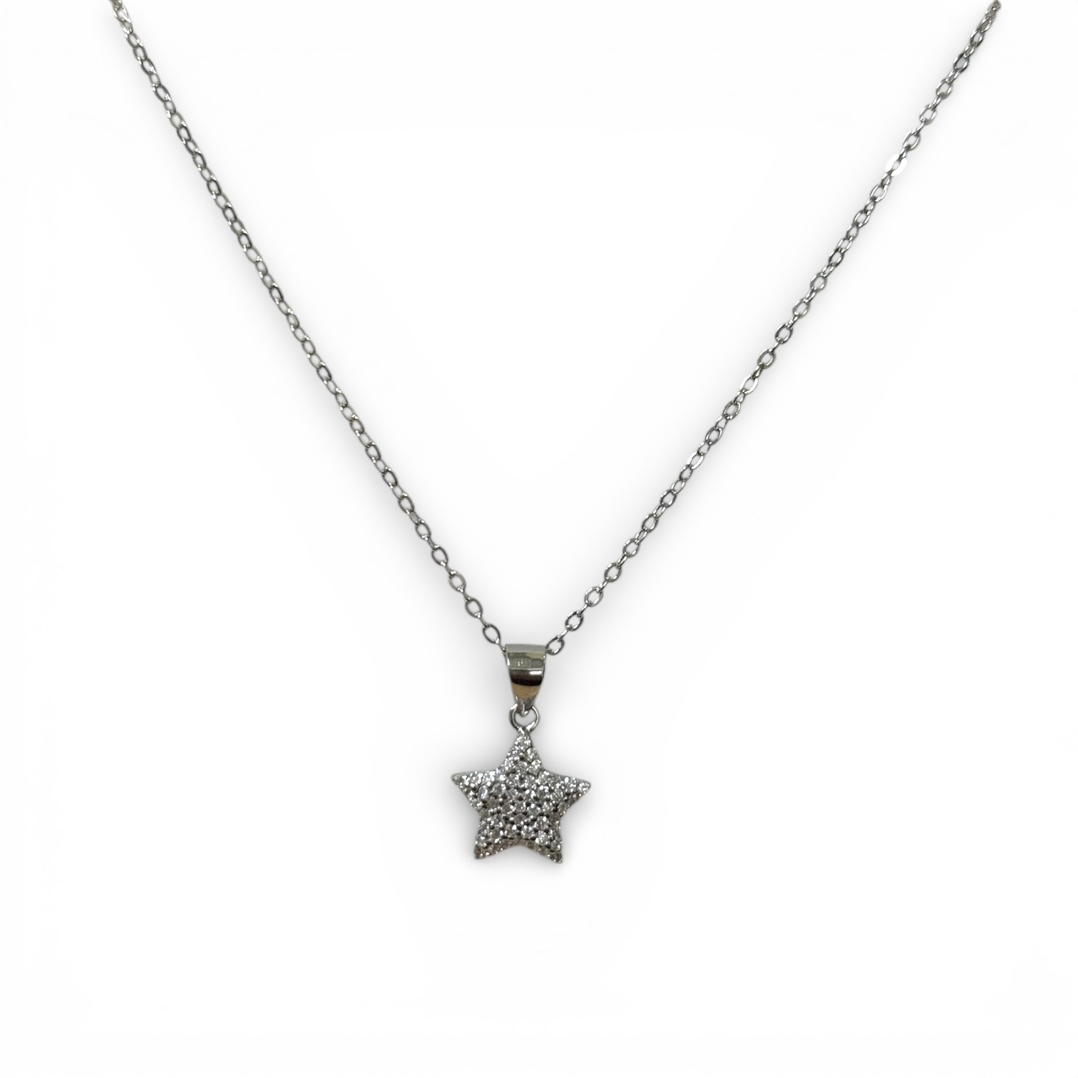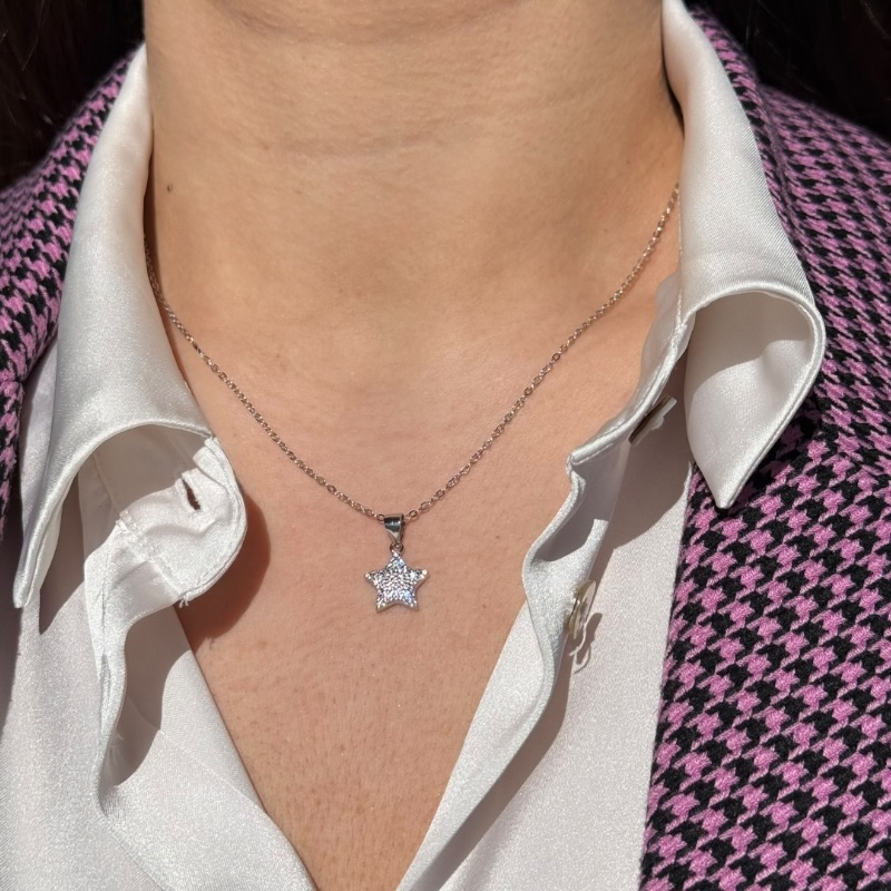 Collana da donna in argento 925 con stella bombata tempestata da zirconi. Chiusura a moschettone
