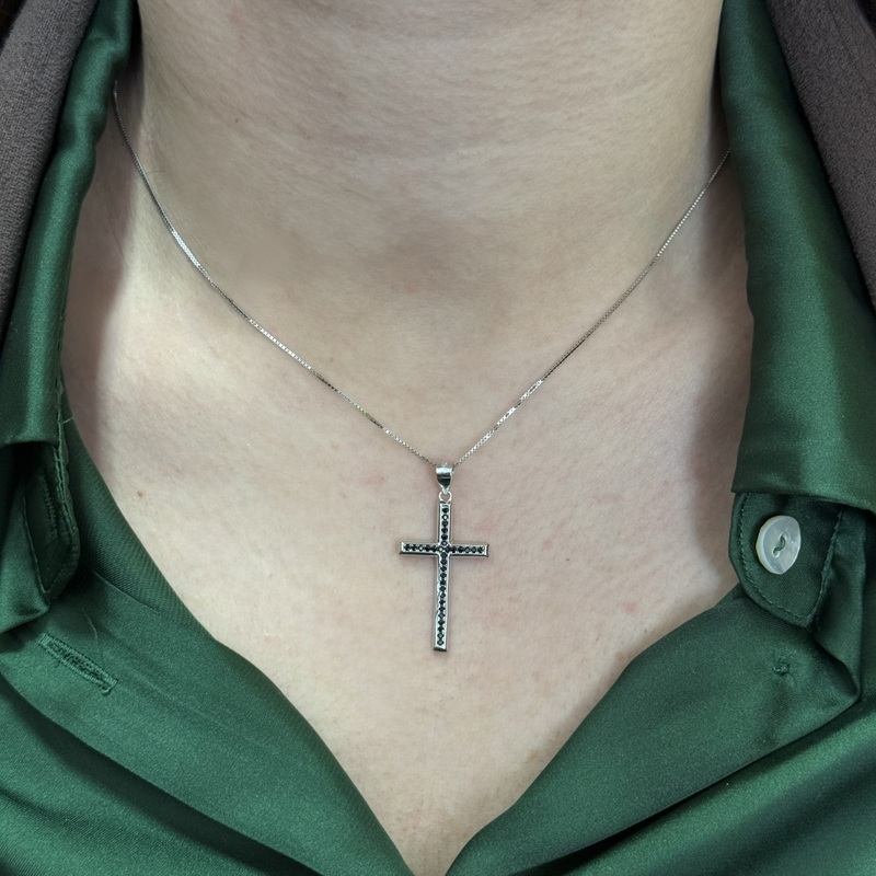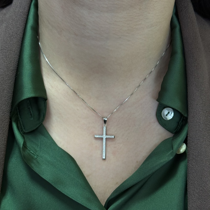 Collana in argento 925 con croce pendente impreziosita da zirconi. Chiusura a molla regolabile.