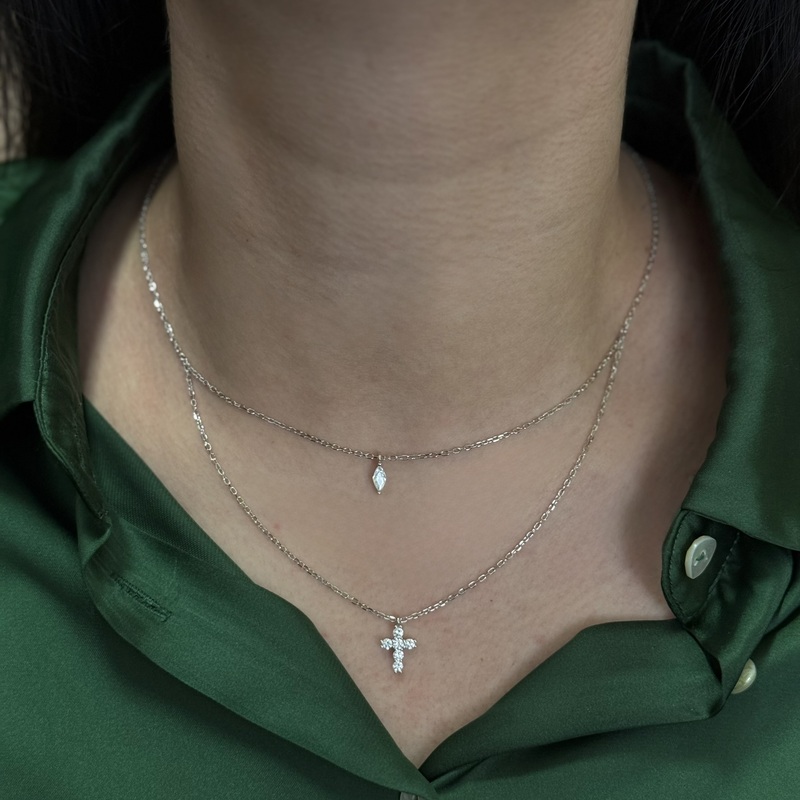 Collana da donna in argento 925 con croce pendente zirconato e goccia zirconata. Chiusura a moschettone regolabile